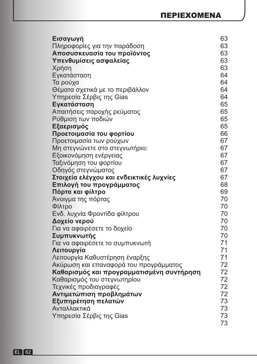 EL 72 ΑΝΤΙΜΕΤΩΠΙΣΗ ΠΡΟΒΛΗΜΑΤΩΝ Ποια μπορεί να είναι η αιτία για… Προβλήματα που μπορείτε να διορθώσετε Πριν καλέσετε την υπηρεσία Σέρβις της GIAS για τεχνικές συμβουλές, ελέγξτε όλη την παρακάτω λίστα ελέγχου. Θα χρεωθείτε αν βρεθεί ότι η συσκευή λειτουργεί ή έχει εγκατασταθεί ή χρησιμοποιείται λανθασμένα. Αν το πρόβλημα επιμένει μετά την ολοκλήρωση των συνιστώμενων ελέγχων, καλέστε την υπηρεσία Σέρβις της GIAS. Ίσως να μπορέσουν να σας βοηθήσουν μέσω Πολύ μεγάλος χρόνος στεγνώματος/ ρούχα όχι εντελώς στεγνά… ● Έχετε επιλέξει σωστό χρόνο/ πρόγραμμα στεγνώματος; ● Μήπως τα ρούχα ήταν πολύ βρεγμένα; Στύφτηκαν τα ρούχα καλά με το χέρι ή σε ● Μήπως το φίλτρο χρειάζεται καθαρισμό; ● Μήπως υπερφορτώθηκε το στεγνωτήριο; ● Μήπως είχε γίνει η επιλογή προηγούμενο κύκλο; Το στεγνωτήριο δεν λειτουργεί… ● Υπάρχει κανονική παροχή ρεύματος προς το στεγνωτήριο; Ελέγξτε με χρήση άλλης συσκευής όπως επιτραπέζιου φωτιστικού. ● Έχει συνδεθεί σωστά το φις στην παροχή ρεύματος δικτύου; ● Μήπως υπάρχει διακοπή ρεύματος; ● Μήπως έχει καεί η ασφάλεια; ● Είναι καλά κλεισμένη η πόρτα; ● Έχει ενεργοποιηθεί το στεγνωτήριο, τόσο στην παροχή ρεύματος όσο και στο μηχάνημα; ● Έχει επιλεγεί ο χρόνος στεγνώματος ή το ● Έχει ενεργοποιηθεί πάλι η συσκευή μετά το άνοιγμα της πόρτας; ΕΞΥΠΗΡΕΤΗΣΗ ΠΕΛΑΤΩΝ Αν εξακολουθεί να υπάρχει πρόβλημα με το στεγνωτήριό σας μετά την ολοκλήρωση όλων των συνιστώμενων ελέγχων, καλέστε την υπηρεσία Σέρβις της GIAS για συμβουλές. Ίσως να μπορούν να σας βοηθήσουν μέσω τηλεφώνου ή να κλείσετε κατάλληλο ραντεβού για επίσκεψη τεχνικού βάσει των όρων της εγγύησής σας. Ωστόσο, μπορεί να υπάρξει χρέωση αν για τη συσκευή σας ισχύει κάποιο από τα εξής: