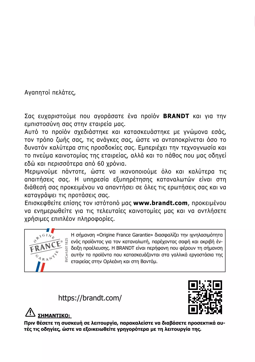 Dans un souci permanent de toujours mieux satisfaire vos exigences, notre service consommateurs est à votre disposition et à votre écoute pour répondre à toutes vos questions ou suggestions. Connectez-vous aussi sur notre site www.brandt.com où vous trouverez nos dernières innovations, ainsi que des informations utiles et complémentaires. BRANDT est heureux de vous accompagner au quotidien et vous souhaite de profiter pleinement de votre achat.