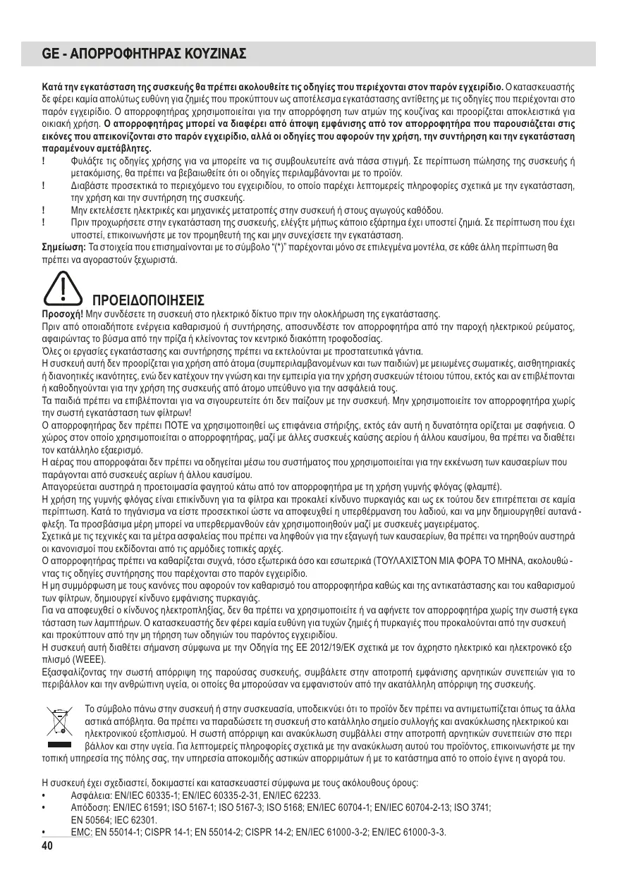 Avant toute opération de nettoyage ou d’entretien, débrancher la hotte du circuit électrique en retirant la prise ou en coupant l’interrupteur général de l’habitation. Munissez-vous de gants de travail avant d’effectuer toute opération d’installation et d’entretien. L’appareil n’est pas destiné à une utilisation par des enfants ou des personnes à capacités physiques, sensorielles ou mentales réduites et sans expérience et connaissance à moins qu’ils ne soient sous la supervision ou formés sur l’utilisation de l’appareil par une personne responsable de leur sécurité. Les enfants doivent être surveillés afin qu’ils ne jouent pas avec l’appareil. Ne jamais utiliser la hotte sans que la grille ne soit montée correctement! La hotte ne doit JAMAIS être utilisée comme plan pour déposer quelque chose sauf si cela est expressément indiqué. Quand la hotte est utilisée en même temps que d’autres appareils à combustion de gaz ou d’autres combustibles, le local doit disposer d’une ventilation suffisante. L’air aspiré ne doit jamais être envoyé dans un conduit utilisé pour l’évacuation des fumées produites par des appareils à combustion de gaz ou d’autres combustibles. Il est formellement interdit de faire flamber les aliments sous la hotte. L’utilisation de flammes libres peut entraîner des dégâts aux filtres et peut donner lieu à des incendies, il faut donc les éviter à tout prix. La friture d’aliments doit être réalisée sous contrôle pour éviter que l’huile surchauffée ne prenne feu. Les pièces accessibles peuvent se réchauffer de façon importante quand elles sont utilisées avec des appareils pour la cuisson. En ce qui concerne les mesures techniques et de sécurité à adopter pour l’évacuation des fumées, s’en tenir strictement à ce qui est prévu dans les règlements des autorités locales compétentes. La hotte doit être régulièrement nettoyée, aussi bien à l’intérieur qu’à l’extérieur (AU MOINS UNE FOIS PAR MOIS, respecter néanmoins les instructions relatives à l’entretien fournies dans ce manuel). La non observation de ces normes de nettoyage de la hotte et du changement et nettoyage des filtres comporte des risques d’incendie. Ne pas utiliser ou laisser la hotte sans que les ampoules soient correctement placées pour éviter tout risque de choc électrique. La société décline toute responsabilité pour d’éventuels inconvénients, dégâts ou incendies provoqués par l’appareil et dérivés de la non observation des instructions reprises dans ce manuel. Cet appareil porte le symbole du recyclage conformément à la Directive Européenne 2012/19/CE concernant les Déchets d’Équipements Électriques et Électroniques (DEEE ou WEEE). En procédant correctement à la mise au rebut de cet appareil, vous contribuerez à empêcher toute conséquence nuisible pour l’environnement et la santé de l’homme. Le symbole présent sur l’appareil ou sur la documentation qui l’accompagne indique que ce produit ne peut en aucun cas être traité comme déchet ménager. Il doit par conséquent être remis à un centre de collecte des déchets chargé du recyclage des équipements électriques et électroniques. Pour la mise au rebut, respectez les normes relatives à l’élimination des déchets en vigueur dans le pays d’installation. Pour obtenir de plus amples détails au sujet du traitement, de la récupération et du recyclage de cet appareil, veuillez vous adresser au bureau compétent de votre commune, à la société de collecte des déchets ou directement à votre revendeur.