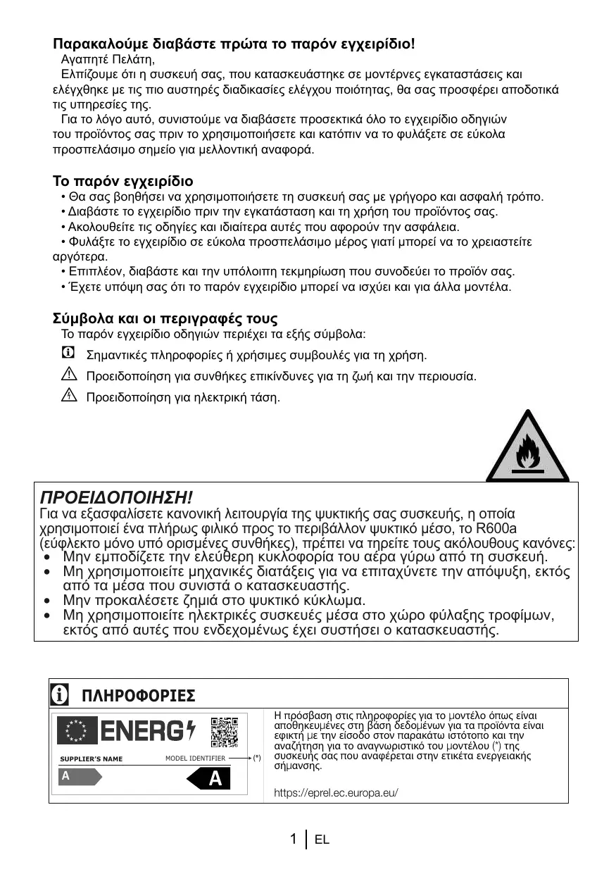 Le type de gaz utilisé dans l'appareil est mentionné sur la plaque signalétique située sur la paroi gauche de l'intérieur du réfrigérateur.