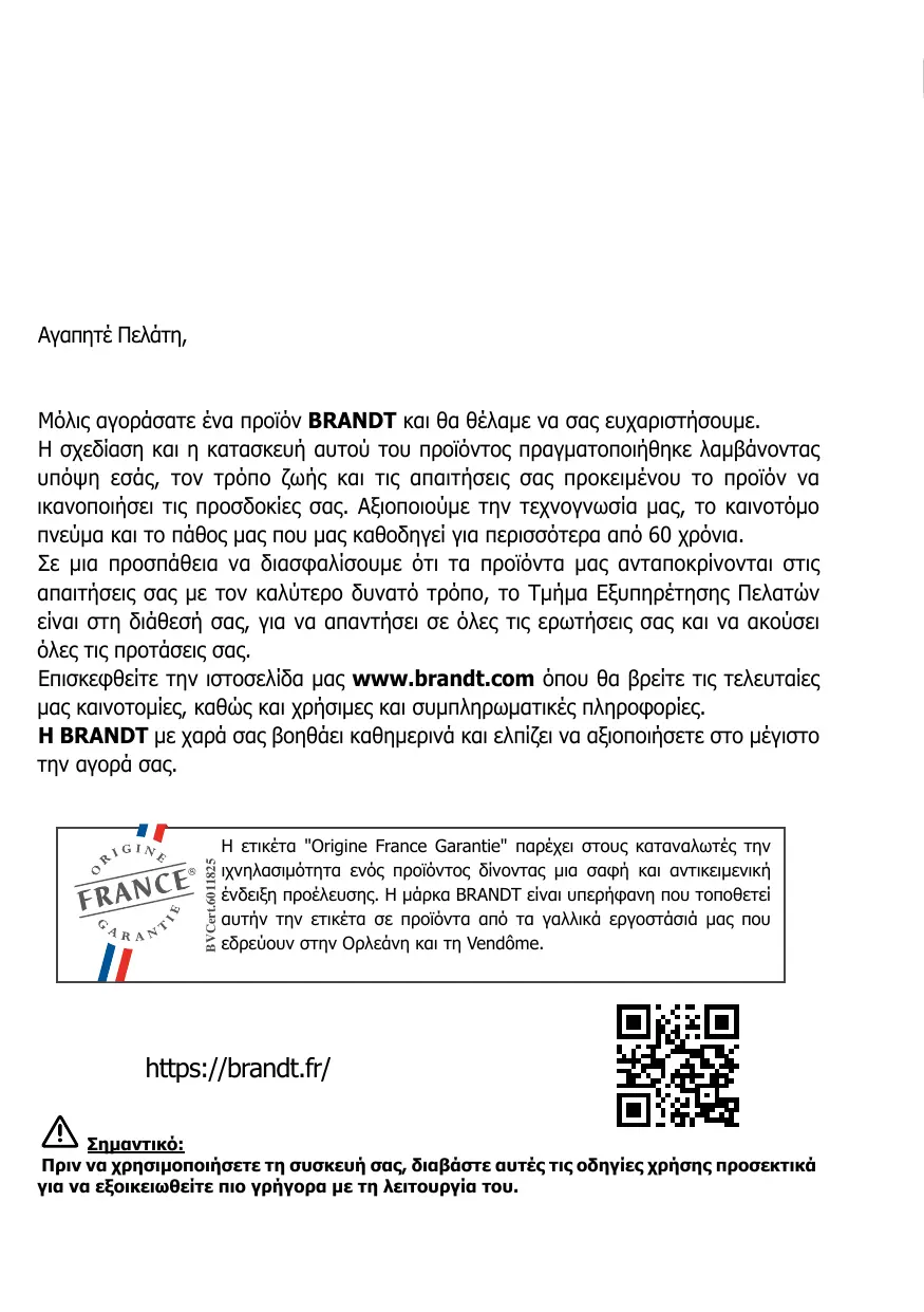 BRANDT est heureux de vous accompagner au quotidien et vous souhaite de profiter pleinement de votre achat.