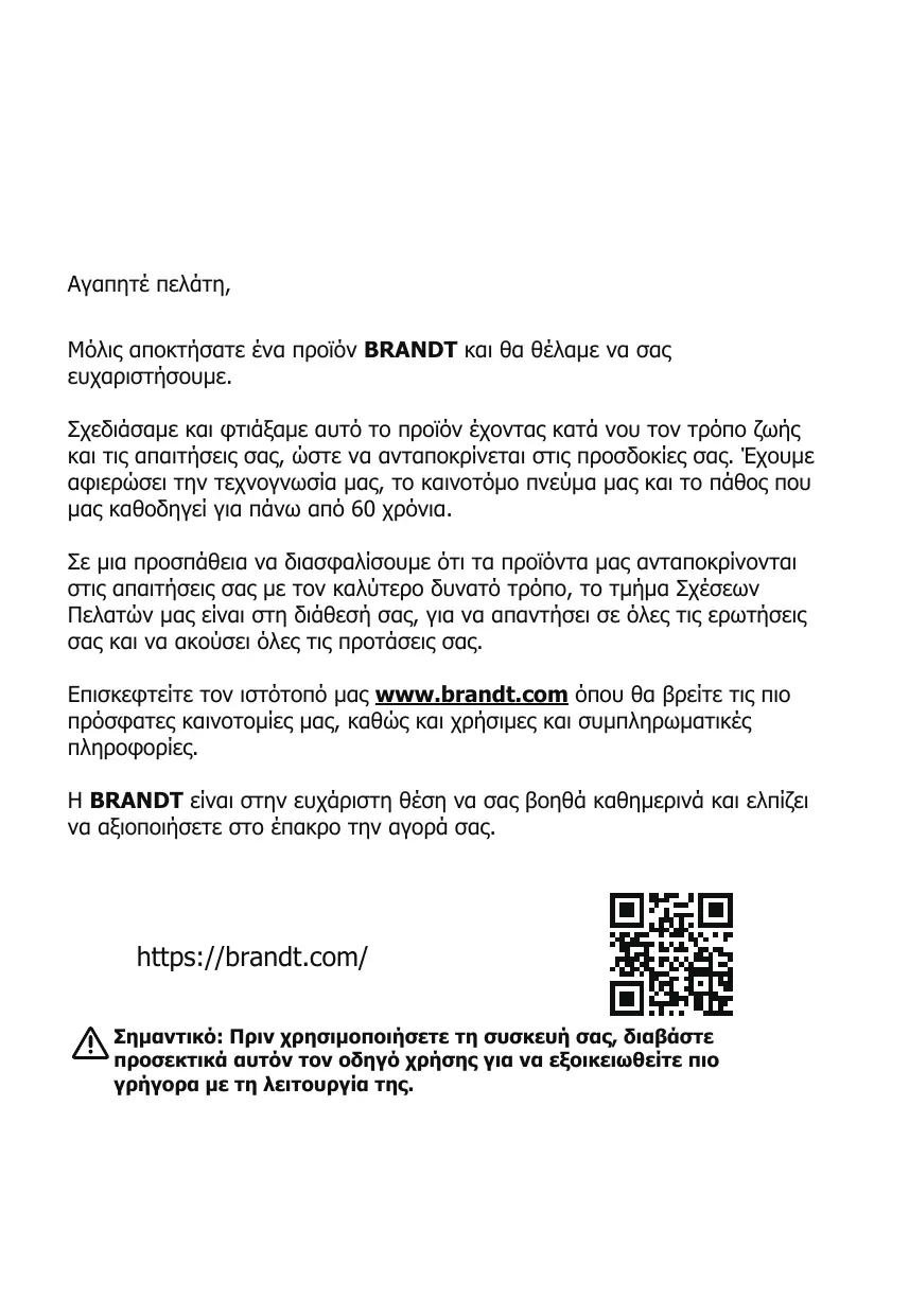 BRANDT est ravi de vous aider au quotidien et espère que vous tirerez le meilleur parti de votre achat.