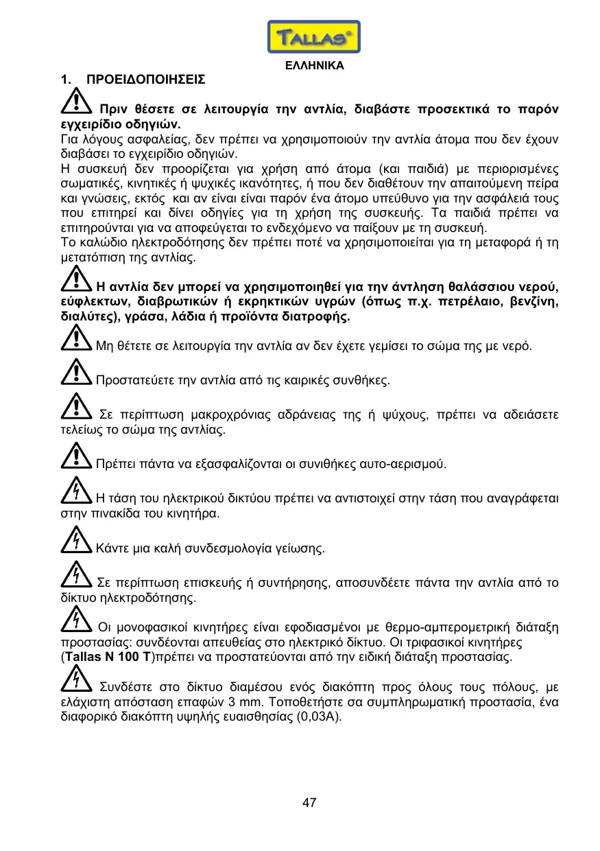 Βρείτε δωρεάν το εγχειρίδιο της συσκευής G100 4500 L/H TALLAS σε μορφή PDF.