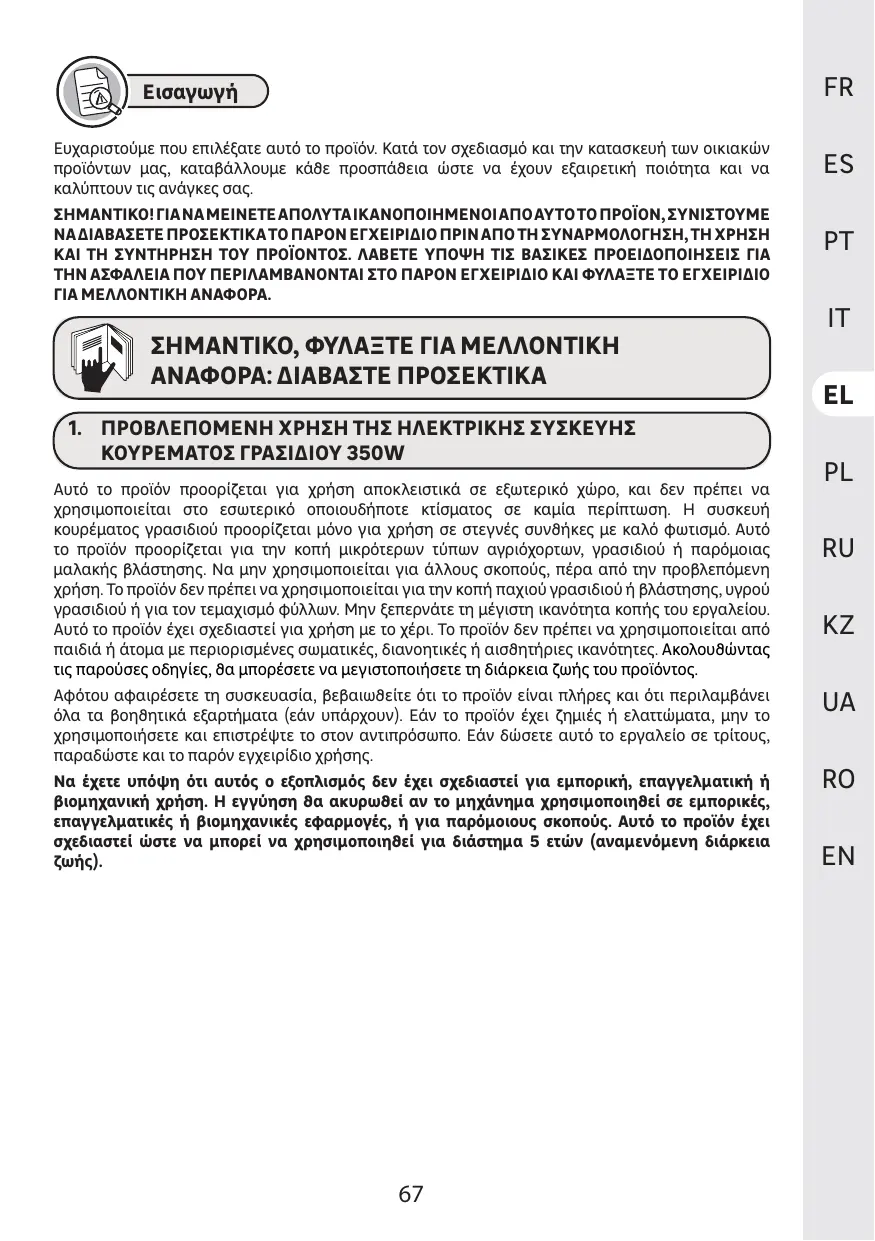 Le produit doit être utilisé dans des conditions normales d'utilisation et à des finalités non professionnelles. Par conséquent, sont exclus de cette garantie les produits utilisés par les entreprises de jardinage, les administrations Locales, ainsi que les entreprises proposant des services de Location payante ou de prêt gratuit d'équipements.