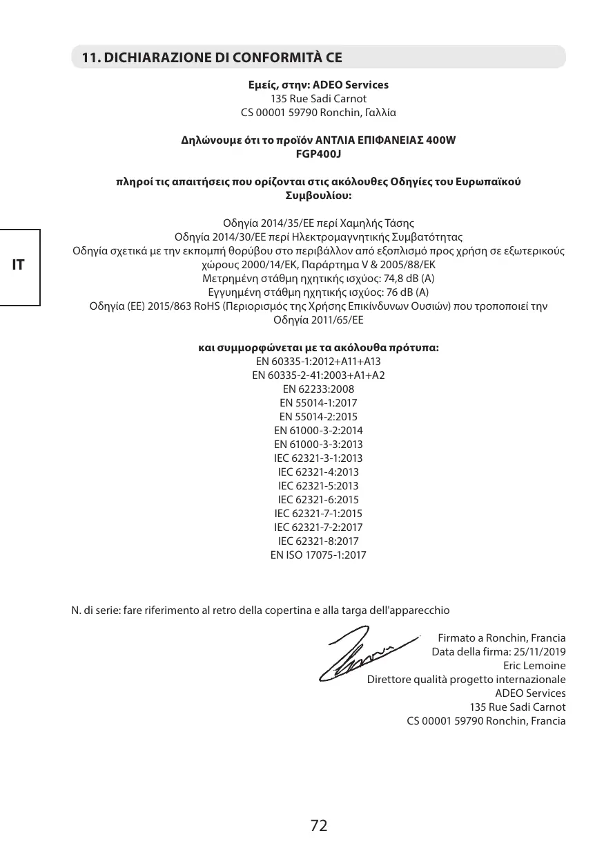 IEC 62321-7-1:2015 IEC 62321-7-2:2017 11. CE DECLARATION OF CONFORMITY We : ADEO Services 135 Rue Sadi Carnot EN 61000-3-3:2013 IEC 62321-3-1:2013 IEC 62321-4:2013 IEC 62321-5: IEC 62321-6: Este produto 6 reciclävel. Se deixar de o utilizar, entregue-0 num centro de reciclagem de resfduos.