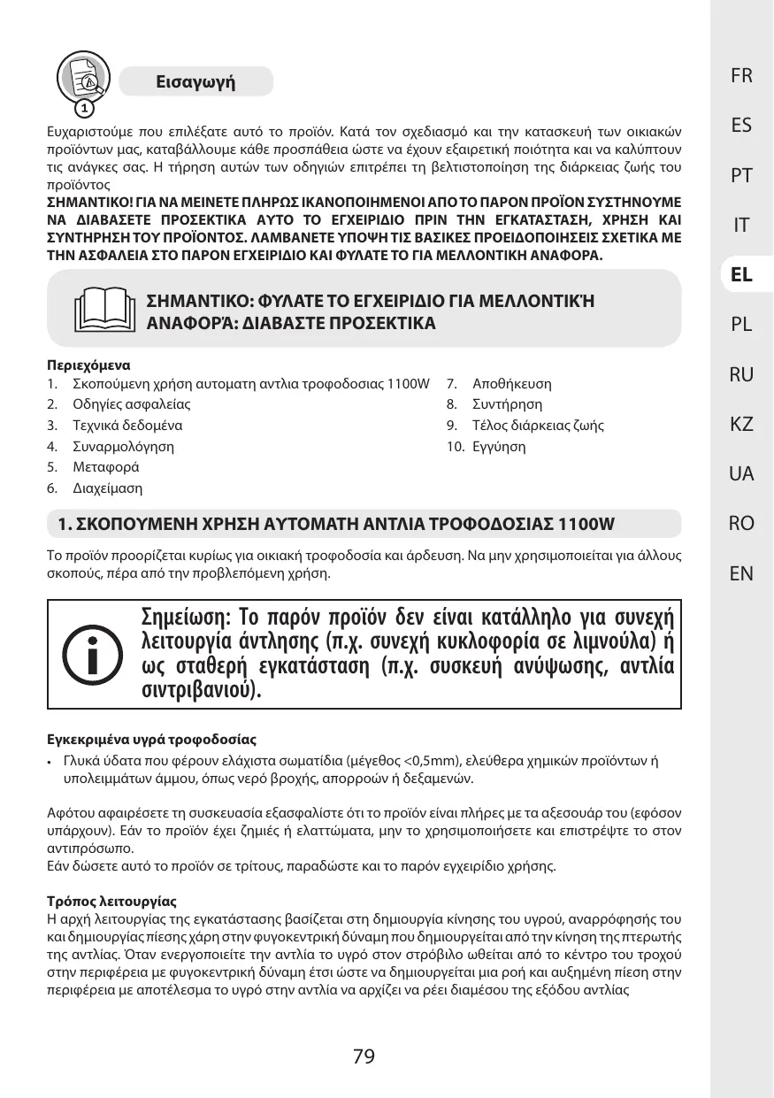 1. Utilisation prévue de la pompe d'alimentation automatique 1100W 7. Rangement (le cas échéant). Si le produit est endommagé ou présente un défaut, ne l'utilisez pas et retournez-le à votre revendeur.