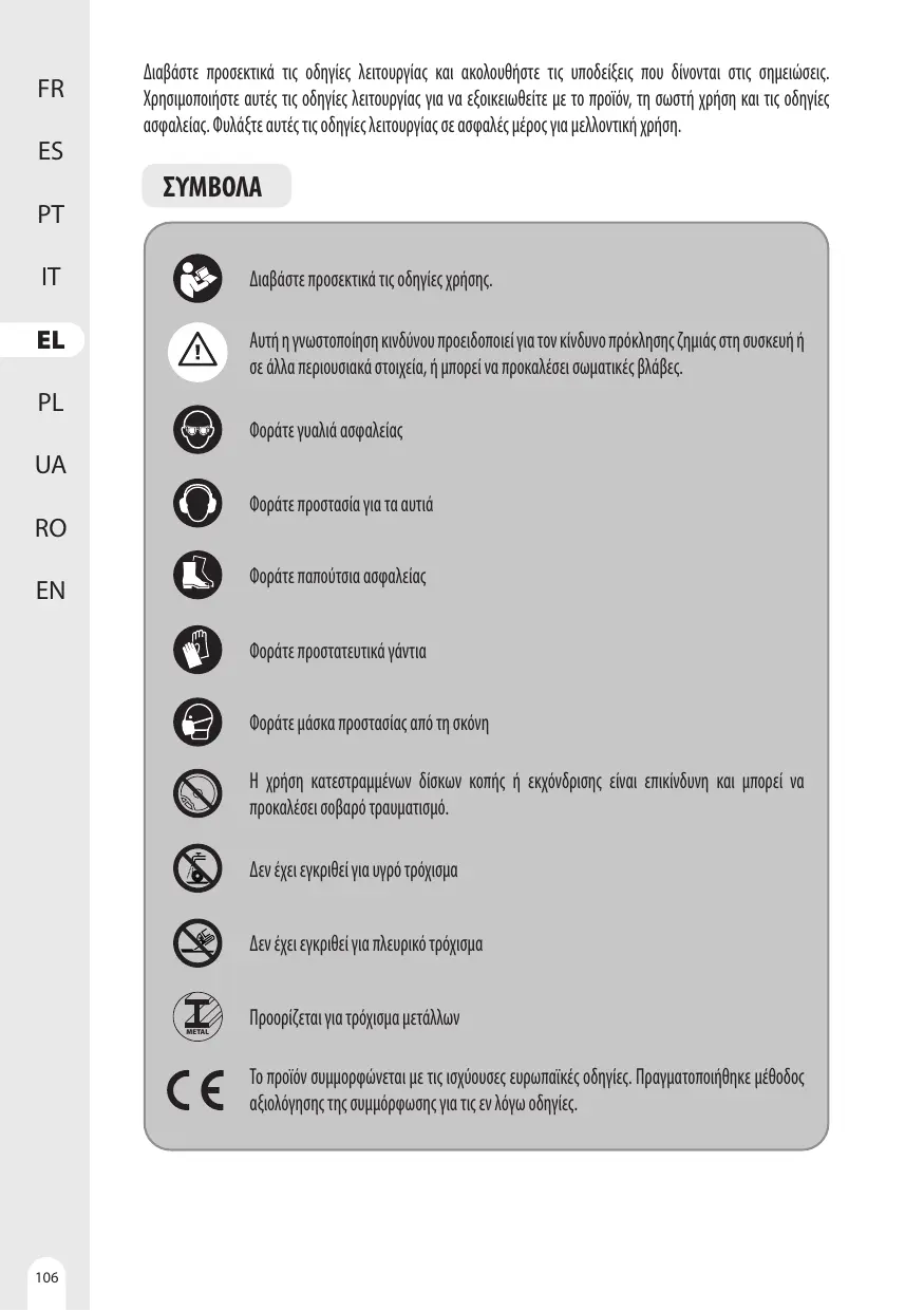 AVERTISSEMENT : Assurez-vous que la meuleuse d'angle est éteinte et débranchée du secteur. PT Selon quil s'agit de couper ou de meuler, choisissez le bon carter de protection. Si vous n'utilisez pas le bon IT arter, vous risquez de vous blesser. Lors de l'utilisation d'un disque pour le meulage ou d'un disque pour la découpe, le carter de protection doit être monté sur l'outil de manière à ce que le côté fermé du carter soit EL toujours orienté vers l'utilisateur.