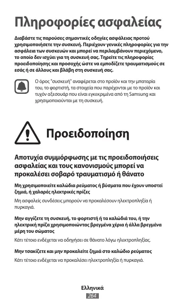 Πληροφορίες ασφαλείας Διαβάστε τις παρούσες σημαντικές οδηγίες ασφάλειας προτού χρησιμοποιήσετε την συσκευή. Περιέχουν γενικές πληροφορίες για την ασφάλεια των συσκευών και μπορεί να περιλαμβάνουν περιεχόμενο, το οποίο δεν ισχύει για τη συσκευή σας. Τηρείτε τις πληροφορίες προειδοποίησης και προσοχής ώστε να εμποδίζετε τραυματισμούς σε εσάς ή σε άλλους και βλάβη στη συσκευή σας. Ο όρος "συσκευή" αναφέρεται στο προϊόν και την μπαταρία του, το φορτιστή, τα στοιχεία που παρέχονται με το προϊόν και τυχόν αξεσουάρ που είναι εγκεκριμένα από τη Samsung και χρησιμοποιούνται με τη συσκευή. Προειδοποίηση Αποτυχία συμμόρφωσης με τις προειδοποιήσεις ασφαλείας και τους κανονισμούς μπορεί να προκαλέσει σοβαρό τραυματισμό ή θάνατο Μη χρησιμοποιείτε καλώδια ρεύματος ή βύσματα που έχουν υποστεί ζημιά, ή χαλαρές ηλεκτρικές πρίζες Μη ασφαλείς συνδέσεις μπορούν να προκαλέσουν ηλεκτροπληξία ή Μην αγγίζετε τη συσκευή, το φορτιστή ή τα καλώδιά του, ή την ηλεκτρική πρίζα χρησιμοποιώντας βρεγμένα χέρια ή άλλα βρεγμένα μέρη του σώματος Κάτι τέτοιο ενδέχεται να οδηγήσει σε θάνατο λόγω ηλεκτροπληξίας. Μην τσακίζετε και μην προκαλείτε ζημιά στο καλώδιο ρεύματος Κάτι τέτοιο ενδέχεται να προκαλέσει ηλεκτροπληξία ή πυρκαγιά.