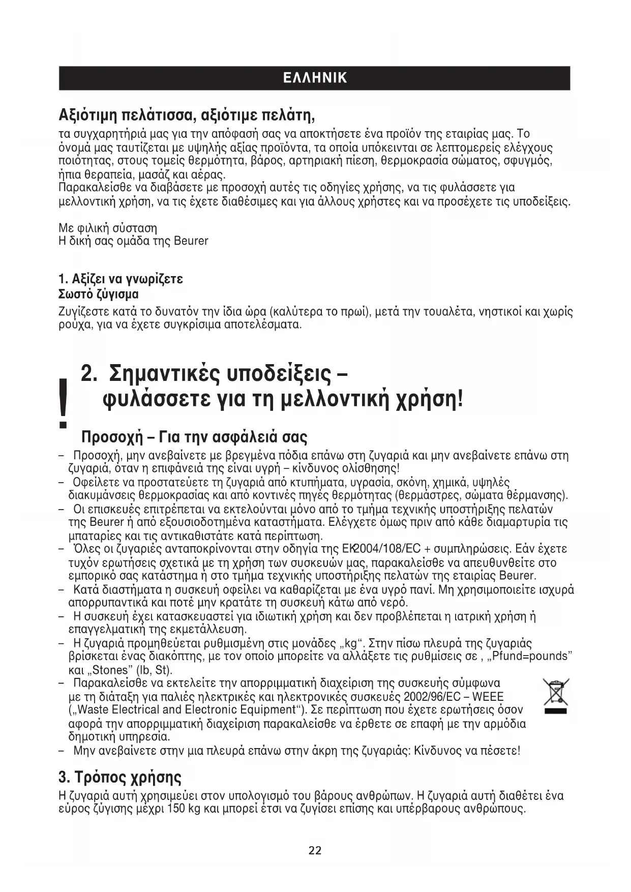 – Πρσή,µηνανεαίνετεµερεγµέναπδιαεπάνωστηυγαριάκαιµηνανεαίνετεεπάνωστηυγαριά,τανηεπιάνειάτηςείναιυγρή–κίνδυνςλίσθησης!– είλετεναπρστατεύετετηυγαριάαπκτυπήµατα,υγρασία,σκνη,ηµικά,υψηλέςδιακυµάνσειςθερµκρασίαςκαιαπκντινέςπηγέςθερµτητας(θερµάστρες,σώµαταθέρµανσης).– ιεπισκευέςεπιτρέπεταιναεκτελύνταιµναπττµήµατενικήςυπστήριηςπελατώντηςBeurerήαπευσιδτηµένακαταστήµατα.Ελέγετεµωςπριναπκάθεδιαµαρτυρίατιςµπαταρίεςκαιτιςαντικαθιστάτεκατάπερίπτωση.– λεςιυγαριέςανταπκρίννταιστηνδηγίατηςΕΚ2004/108/EC+συµπληρώσεις.Εάνέετετυνερωτήσειςσετικάµετηρήσητωνσυσκευώνµας,παρακαλείσθενααπευθυνθείτεστεµπρικσαςκατάστηµαήσττµήµατενικήςυπστήριηςπελατώντηςεταιρίαςBeurer.– Κατάδιαστήµαταησυσκευήείλεινακαθαρίεταιµεέναυγρπανί.Μηρησιµπιείτεισυράαπρρυπαντικάκαιπτέµηνκρατάτετησυσκευήκάτωαπνερ.– Ησυσκευήέεικατασκευαστείγιαιδιωτικήρήσηκαιδενπρλέπεταιηιατρικήρήσηήεπαγγελµατικήτηςεκµετάλλευση.– Ηυγαριάπρµηθεύεταιρυθµισµένηστιςµνάδες„kg“.Στηνπίσωπλευράτηςυγαριάςρίσκεταιέναςδιακπτης,µετνπίµπρείτενααλλάετετιςρυθµίσειςσε,„Pfund=pounds”και„Stones”(lb,St).– Παρακαλείσθεναεκτελείτετηναπρριµµατικήδιαείρισητηςσυσκευήςσύµωναµετηδιάταηγιαπαλιέςηλεκτρικέςκαιηλεκτρνικέςσυσκευές2002/96/EC–WEEE(„WasteElectricalandElectronicEquipment“).Σεπερίπτωσηπυέετεερωτήσειςσναράτηναπρριµµατικήδιαείρισηπαρακαλείσθεναέρθετεσεεπαήµετηναρµδιαδηµτικήυπηρεσία.– Μηνανεαίνετεστηνµιαπλευράεπάνωστηνάκρητηςυγαριάς:Κίνδυνςναπέσετε! Ηυγαριάαυτήρησιµεύειστνυπλγισµτυάρυςανθρώπων.Ηυγαριάαυτήδιαθέτειέναεύρςύγισηςµέρι150kgκαιµπρείέτσιναυγίσειεπίσηςκαιυπέραρυςανθρώπυς. !23