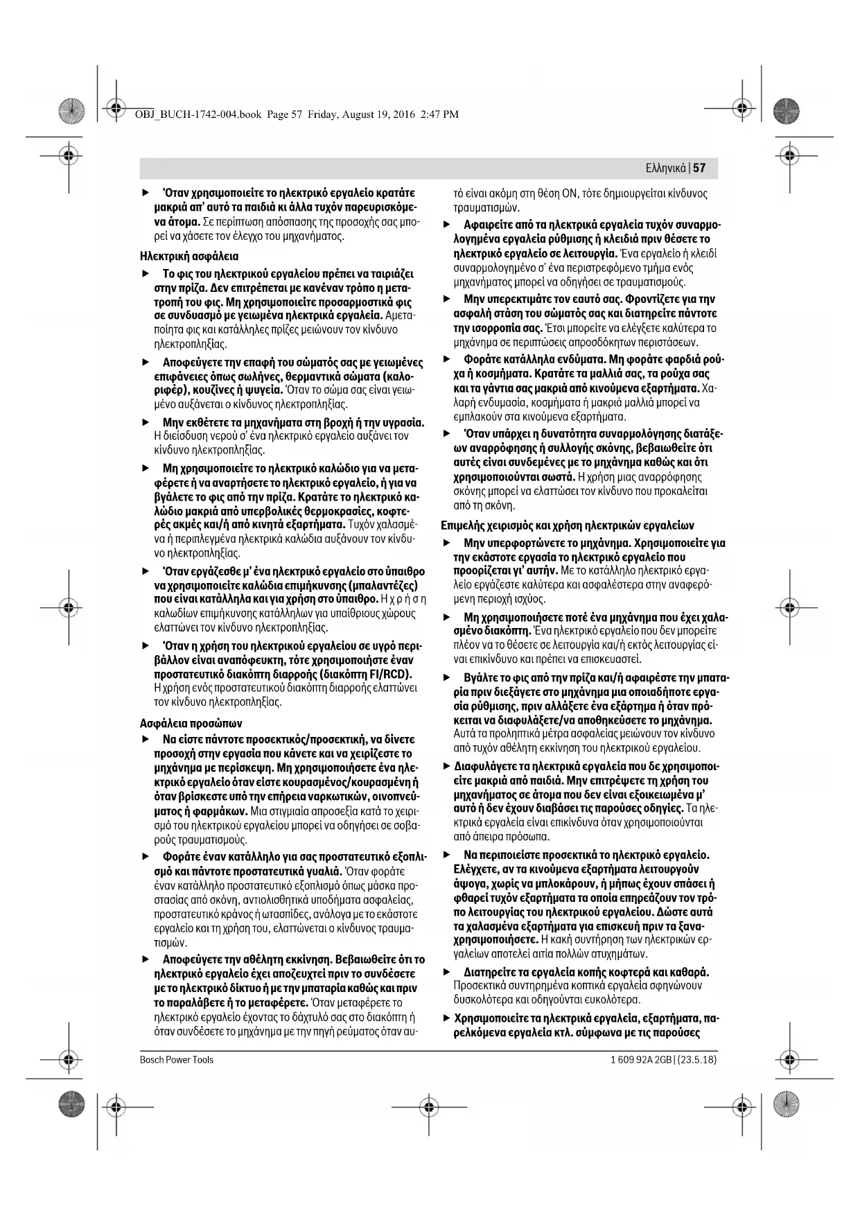 Διαβάστε όλες τις υποδείξεις ασφαλείας και τις οδηγίες. Αμέ- λειες κατά την τήρηση των υποδείξεων ασφαλείας και των οδη- γιών μπορεί να προκαλέσουν ηλεκτροπληξία, πυρκαγιά ή/και σοβαρούς τραυματισμούς. Φυλάξτε όλες τις προειδοποιητικές υποδείξεις και οδηγίες για κάθε μελλοντική χρήση. Ο ορισμός «Ηλεκτρικό εργαλείο» που χρησιμοποιείται στις προ- ειδοποιητικές υποδείξεις αναφέρεται σε ηλεκτρικά εργαλεία που τροφοδοτούνται από το ηλεκτρικό δίκτυο (με ηλεκτρικό κα- λώδιο) καθώς και σε ηλεκτρικά εργαλεία που τροφοδοτούνται από μπαταρία (χωρίς ηλεκτρικό καλώδιο). Ασφάλεια στο χώρο εργασίας Διατηρείτε τον τομέα που εργάζεσθε καθαρό και καλά φωτισμένο. Αταξία ή σκοτεινές περιοχές εργασίας μπορεί να οδηγήσουν σε ατυχήματα. Μην εργάζεσθε με το ηλεκτρικό εργαλείο σε περιβάλ- λον όπου υπάρχει κίνδυνος έκρηξης, στο οποίο υπάρ- χουν εύφλεκτα υγρά, αέρια ή σκόνες. Τα ηλεκτρικά εργα- λεία δημιουργούν σπινθηρισμό ο οποίος μπορεί να αναφλέ- ξει τη σκόνη ή τις αναθυμιάσεις. OBJ_BUCH-1742-004.book Page 56 Friday, August 19, 2016 2:47 PMΕλληνικά | 57 Bosch Power Tools 1 609 92A 2GB | (23.5.18) Όταν χρησιμοποιείτε το ηλεκτρικό εργαλείο κρατάτε μακριά απ’ αυτό τα παιδιά κι άλλα τυχόν παρευρισκόμε- να άτομα. Σε περίπτωση απόσπασης της προσοχής σας μπο- ρεί να χάσετε τον έλεγχο του μηχανήματος. Ηλεκτρική ασφάλεια Το φις του ηλεκτρικού εργαλείου πρέπει να ταιριάζει στην πρίζα. Δεν επιτρέπεται με κανέναν τρόπο η μετα- τροπή του φις. Μη χρησιμοποιείτε προσαρμοστικά φις σε συνδυασμό με γειωμένα ηλεκτρικά εργαλεία. Αμετα- ποίητα φις και κατάλληλες πρίζες μειώνουν τον κίνδυνο ηλεκτροπληξίας. Αποφεύγετε την επαφή του σώματός σας με γειωμένες επιφάνειες όπως σωλήνες, θερμαντικά σώματα (καλο- ριφέρ), κουζίνες ή ψυγεία. Όταν το σώμα σας είναι γειω- μένο αυξάνεται ο κίνδυνος ηλεκτροπληξίας. Μην εκθέτετε τα μηχανήματα στη βροχή ή την υγρασία. Η διείσδυση νερού σ’ ένα ηλεκτρικό εργαλείο αυξάνει τον κίνδυνο ηλεκτροπληξίας. Μη χρησιμοποιείτε το ηλεκτρικό καλώδιο για να μετα- φέρετε ή να αναρτήσετε το ηλεκτρικό εργαλείο, ή για να βγάλετε το φις από την πρίζα. Κρατάτε το ηλεκτρικό κα- λώδιο μακριά από υπερβολικές θερμοκρασίες, κοφτε- ρές ακμές και/ή από κινητά εξαρτήματα. Τυχόν χαλασμέ- να ή περιπλεγμένα ηλεκτρικά καλώδια αυξάνουν τον κίνδυ- νο ηλεκτροπληξίας. Όταν εργάζεσθε μ’ ένα ηλεκτρικό εργαλείο στο ύπαιθρο να χρησιμοποιείτε καλώδια επιμήκυνσης (μπαλαντέζες) που είναι κατάλληλα και για χρήση στο ύπαιθρο. Ηχρήση καλωδίων επιμήκυνσης κατάλληλων για υπαίθριους χώρους ελαττώνει τον κίνδυνο ηλεκτροπληξίας. Όταν η χρήση του ηλεκτρικού εργαλείου σε υγρό περι- βάλλον είναι αναπόφευκτη, τότε χρησιμοποιήστε έναν προστατευτικό διακόπτη διαρροής (διακόπτη FI/RCD). Η χρήση ενός προστατευτικού διακόπτη διαρροής ελαττώνει τον κίνδυνο ηλεκτροπληξίας. Ασφάλεια προσώπων Να είστε πάντοτε προσεκτικός/προσεκτική, να δίνετε προσοχή στην εργασία που κάνετε και να χειρίζεστε το μηχάνημα με περίσκεψη. Μη χρησιμοποιήσετε ένα ηλε- κτρικό εργαλείο όταν είστε κουρασμένος/κουρασμένη ή όταν βρίσκεστε υπό την επήρεια ναρκωτικών, οινοπνεύ- ματος ή φαρμάκων. Μια στιγμιαία απροσεξία κατά το χειρι- σμό του ηλεκτρικού εργαλείου μπορεί να οδηγήσει σε σοβα- ρούς τραυματισμούς. Φοράτε έναν κατάλληλο για σας προστατευτικό εξοπλι- σμό και πάντοτε προστατευτικά γυαλιά. Όταν φοράτε έναν κατάλληλο προστατευτικό εξοπλισμό όπως μάσκα προ- στασί