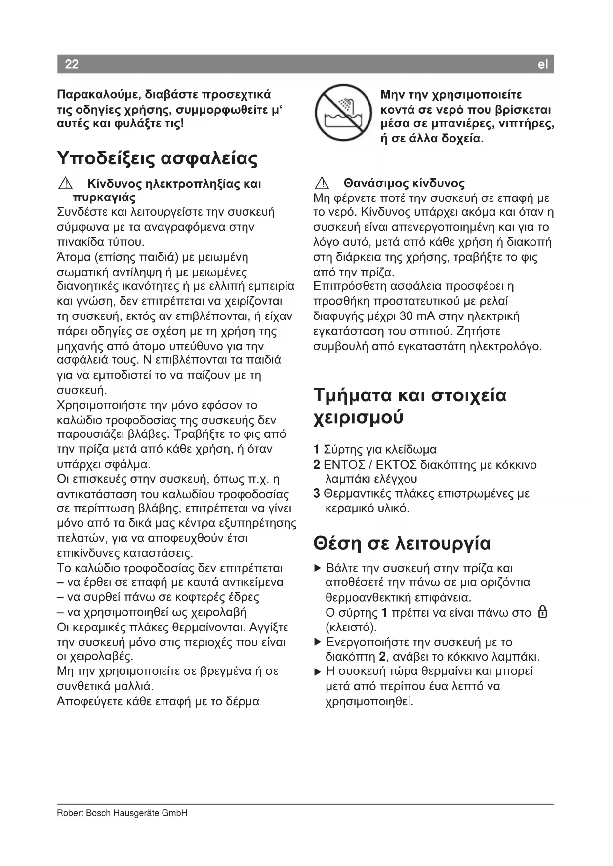 Χρησιμοποιήστε την μόνο εφόσον το καλώδιο τροφοδοσίας της συσκευής δεν παρουσιάζει βλάβες. Τραβήξτε το φις από την πρίζα μετά από κάθε χρήση, ή όταν υπάρχει σφάλμα. Οι επισκευές στην συσκευή, όπως π.χ. η αντικατάσταση του καλωδίου τροφοδοσίας σε περίπτωση βλάβης, επιτρέπεται να γίνει μόνο από τα δικά μας κέντρα εξυπηρέτησης πελατών, για να αποφευχθούν έτσι επικίνδυνες καταστάσεις. Το καλώδιο τροφοδοσίας δεν επιτρέπεται – να έρθει σε επαφή με καυτά αντικείμενα – να συρθεί πάνω σε κοφτερές έδρες – να χρησιμοποιηθεί ως χειρολαβή Οι κεραμικές πλάκες θερμαίνονται. Αγγίξτε την συσκευή μόνο στις περιοχές που είναι οι χειρολαβές. Μη την χρησιμοποιείτε σε βρεγμένα ή σε συνθετικά μαλλιά. Αποφεύγετε κάθε επαφή με το δέρμα Μηντηνχρησιμοποιείτε κοντάσενερόπουβρίσκεται μέσασεμπανιέρες,νιπτήρες, ήσεάλλαδοχεία.
