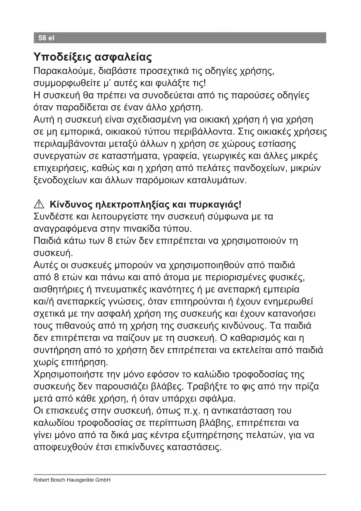 A58 Robert Bosch Hausgeräte GmbH 58 el Υποδείξεις ασφαλείας Παρακαλούμε, διαβάστε προσεχτικά τις οδηγίες χρήσης, συμμορφωθείτε μ’ αυτές και φυλάξτε τις! Η συσκευή θα πρέπει να συνοδεύεται από τις παρούσες οδηγίες όταν παραδίδεται σε έναν άλλο χρήστη. Αυτή η συσκευή είναι σχεδιασμένη για οικιακή χρήση ή για χρήση σε μη εμπορικά, οικιακού τύπου περιβάλλοντα. Στις οικιακές χρήσεις περιλαμβάνονται μεταξύ άλλων η χρήση σε χώρους εστίασης συνεργατών σε καταστήματα, γραφεία, γεωργικές και άλλες μικρές επιχειρήσεις, καθώς και η χρήση από πελάτες πανδοχείων, μικρών ξενοδοχείων και άλλων παρόμοιων καταλυμάτων.