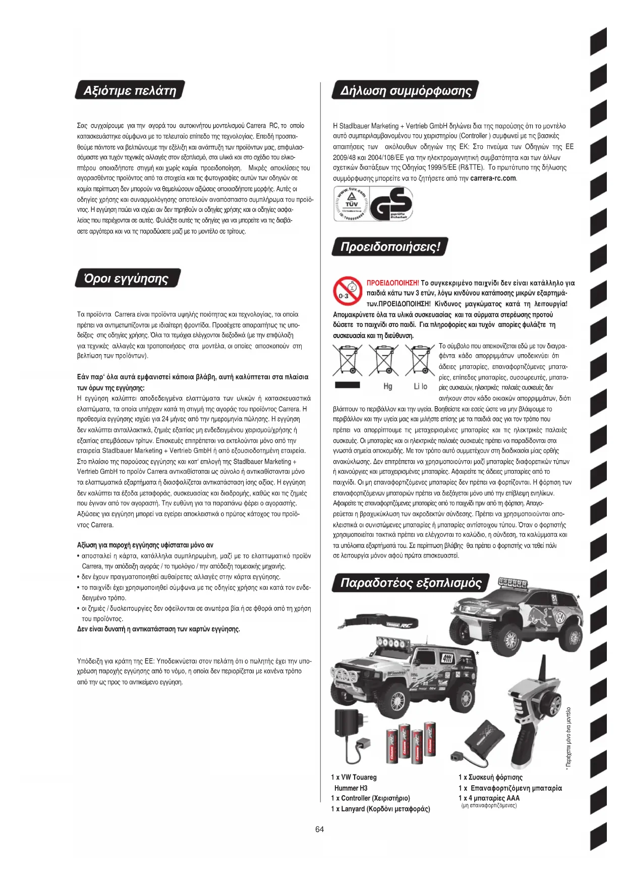 - Περιέχεται μόνο ένα μοντέλο 1 x VW Touareg Hummer H3 1 x Controller (Χειριστήριο) 1 x Lanyard (Κορδόνι εταφοράς) 1 x Συσκευή φόρτισης 1 x Επαναφορτιζόενη παταρία 1 x 4 παταρίες ΑΑΑ (μη επαναφορτιζόμενες) Αξιότιμε πελάτη Σας συγχαίρουμε για την αγορά του αυτοκινήτου μοντελισμού Carrera RC, το οποίο κατασκευάστηκε σύμφωνα με το τελευταίο επίπεδο της τεχνολογίας. Επειδή προσπα- θούμε πάντοτε να βελτιώνουμε την εξέλιξη και ανάπτυξη των προϊόντων μας, επιφυλασ- σόμαστε για τυχόν τεχνικές αλλαγές στον εξοπλισμό, στα υλικά και στο σχέδιο του ελικο- πτέρου οποιαδήποτε στιγμή και χωρίς καμία προειδοποίηση. Μικρές αποκλίσεις του αγορασθέντος προϊόντος από τα στοιχεία και τις φωτογραφίες αυτών των οδηγιών σε καμία περίπτωση δεν μπορούν να θεμελιώσουν αξιώσεις οποιασδήποτε μορφής. Αυτές οι οδηγίες χρήσης και συναρμολόγησης αποτελούν αναπόσπαστο συμπλήρωμα του προϊό- ντος. Η εγγύηση παύει να ισχύει αν δεν τηρηθούν οι οδηγίες χρήσης και οι οδηγίες ασφα- λείας που περιέχονται σε αυτές. Φυλάξτε αυτές τις οδηγίες για να μπορείτε να τις διαβά- σετε αργότερα και να τις παραδώσετε μαζί με το μοντέλο σε τρίτους. Όροι εγγύησης Τα προϊόντα Carrera είναι προϊόντα υψηλής ποιότητας και τεχνολογίας, τα οποία πρέπει να αντιμετωπίζονται με ιδιαίτερη φροντίδα. Προσέχετε απαραιτήτως τις υπο- δείξεις στις οδηγίες χρήσης. Όλα τα τεμάχια ελέγχονται διεξοδικά (με την επιφύλαξη για τεχνικές αλλαγές και τροποποιήσεις στα μοντέλα, οι οποίες αποσκοπούν στη βελτίωση των προϊόντων). Εάν παρ‘ όλα αυτά εφανιστεί κάποια βλάβη, αυτή καλύπτεται στα πλαίσια των όρων της εγγύησης: Η εγγύηση καλύπτει αποδεδειγμένα ελαττώματα των υλικών ή κατασκευαστικά ελαττώματα, τα οποία υπήρχαν κατά τη στιγμή της αγοράς του προϊόντος Carrera. Η προθεσμία εγγύησης ισχύει για 24 μήνες από την ημερομηνία πώλησης. Η εγγύηση δεν καλύπτει ανταλλακτικά, ζημιές εξαιτίας μη ενδεδειγμένου χειρισμού/χρήσης ή εξαιτίας επεμβάσεων τρίτων. Επισκευές επιτρέπεται να εκτελούνται μόνο από την εταιρεία Stadlbauer Marketing + Vertrieb GmbH ή από εξουσιοδοτημένη εταιρεία. Στο πλαίσιο της παρούσας εγγύησης και κατ‘ επιλογή της Stadlbauer Marketing + Vertrieb GmbH το προϊόν Carrera αντικαθίσταται ως σύνολο ή αντικαθίστανται μόνο τα ελαττωματικά εξαρτήματα ή διασφαλίζεται αντικατάσταση ίσης αξίας. Η εγγύηση δεν καλύπτει τα έξοδα μεταφοράς, συσκευασίας και διαδρομής, καθώς και τις ζημιές που έγιναν από τον αγοραστή. Την ευθύνη για τα παραπάνω φέρει ο αγοραστής. Αξιώσεις για εγγύηση μπορεί να εγείρει αποκλειστικά ο πρώτος κάτοχος του προϊό- ντος Carrera. Αξίωση για παροχή εγγύησης υφίσταται όνο αν