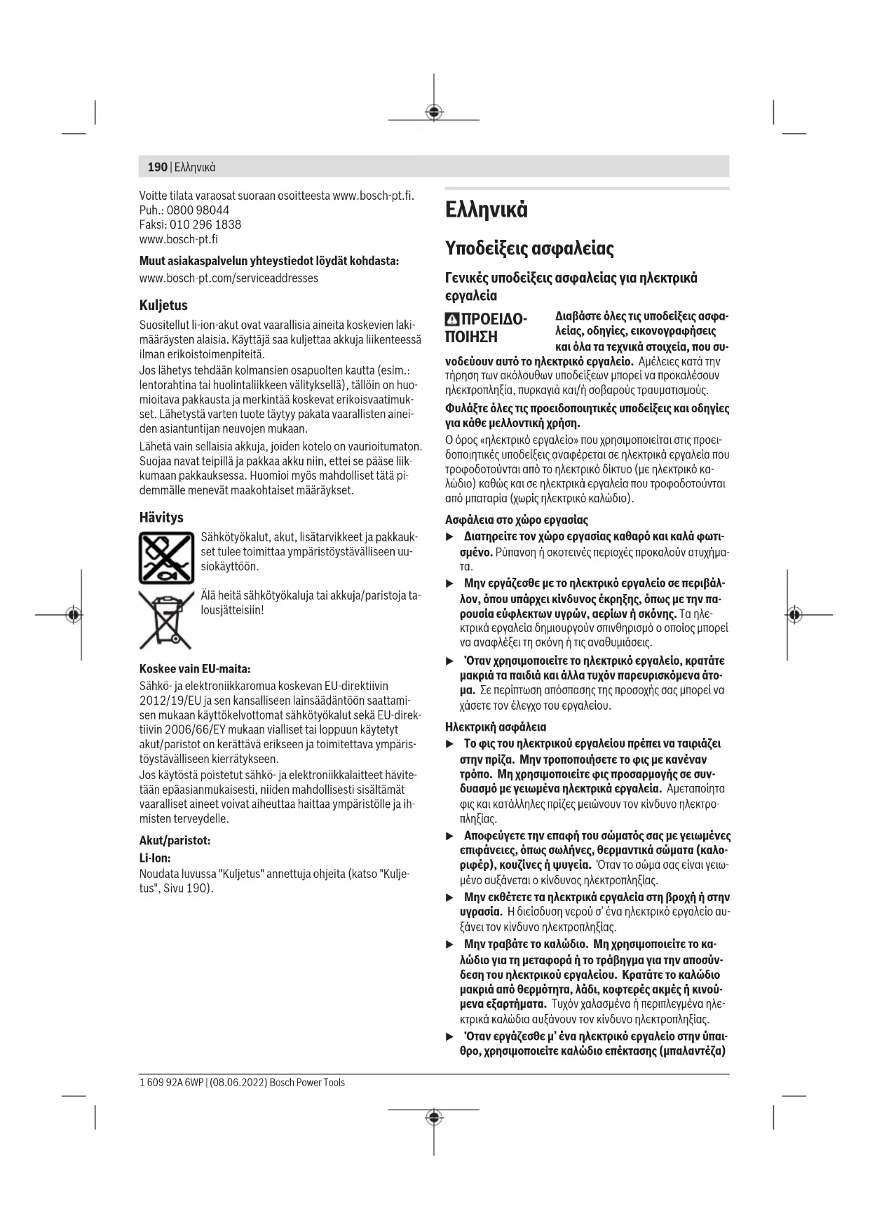 κτρικά καλώδια αυξάνουν τον κίνδυνο ηλεκτροπληξίας. u Όταν εργάζεσθε μ’ ένα ηλεκτρικό εργαλείο στην ύπαι- θρο, χρησιμοποιείτε καλώδιο επέκτασης (μπαλαντέζα) 1 609 92A 6WP | (08.06.2022) Bosch Power ToolsΕλληνικά | 191