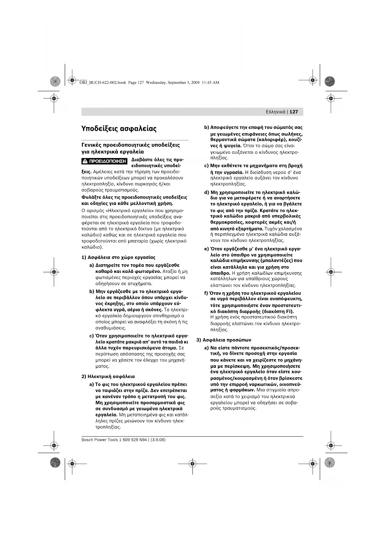 a) Μην υπερφορτώνετε το μηχάνημα. Χρη- σιμοποιείτε για την εκάστοτε εργασία το ηλεκτρικό εργαλείο που προορίζεται γι’ αυτήν. Με το κατάλληλο ηλεκτρικό εργα- λείο εργάζεστε καλύτερα και ασφαλέστερα στην αναφερόμενη περιοχή ισχύος. b) Μη χρησιμοποιήσετε ποτέ ένα μηχάνημα που έχει χαλασμένο διακόπτη. Ένα ηλεκ- τρικό εργαλείο που δεν μπορείτε πλέον να το θέσετε σε λειτουργία και/ή εκτός λει- τουργίας είναι επικίνδυνο και πρέπει να επισκευαστεί. c) Βγάζετε το φις από την πρίζα και/ή αφαιρέστε την μπαταρία πριν διεξάγετε στο μηχάνημα μια οποιαδήποτε εργασία ρύθμισης, πριν αλλάξετε ένα εξάρτημα ή όταν πρόκειται να διαφυλάξετε/να απο- θηκεύσετε το μηχάνημα. Αυτά τα προληπ- τικά μέτρα ασφαλείας μειώνουν τον κίνδυ- νο από τυχόν αθέλητη εκκίνηση του ηλεκ- τρικού εργαλείου. d) Διαφυλάγετε τα ηλεκτρικά εργαλεία που δε χρησιμοποιείτε μακριά από παιδιά. Μην επιτρέψετε τη χρήση του μηχανήμα- τος σε άτομα που δεν είναι εξοικειωμένα μ’ αυτό ή δεν έχουν διαβάσει τις παρού- σες οδηγίες. Τα ηλεκτρικά εργαλεία είναι επικίνδυνα όταν χρησιμοποιούνται από άπειρα πρόσωπα. e) Να περιποιείστε προσεκτικά το ηλεκτρι- κό εργαλείο. Ελέγχετε, αν τα κινούμενα εξαρτήματα λειτουργούν άψογα, χωρίς να μπλοκάρουν, ή μήπως έχουν σπάσει ή φθαρεί τυχόν εξαρτήματα τα οποία επ- ηρεάζουν τον τρόπο λειτουργίας του ηλεκτρικού εργαλείου. Δώστε αυτά τα χαλασμένα εξαρτήματα για επισκευή πριν τα ξαναχρησιμοποιήσετε. Η κακή συντήρηση των ηλεκτρικών εργαλείων αποτελεί αιτία πολλών ατυχημάτων. f) Διατηρείτε τα εργαλεία κοπής κοφτερά και καθαρά. Προσεκτικά συντηρημένα κοπτικά εργαλεία σφηνώνουν δυσκο- λότερα και οδηγούνται ευκολότερα. OBJ_BUCH-622-002.book Page 128 Wednesday, September 3, 2008 11:45 AMEλληνικά | 129 Bosch Power Tools 1 609 929 N94 | (3.9.08) g) Χρησιμοποιείτε ηλεκτρικά εργαλεία, εξαρτήματα, παρελκόμενα εργαλεία κτλ. σύμφωνα με τις παρούσες οδηγίες. Λαμ- βάνετε επίσης υπόψη σας τις εκάστοτε συνθήκες και την υπό εκτέλεση εργασία. Η χρησιμοποίηση των ηλεκτρικών εργα- λείων για εργασίες που δεν προβλέπονται γι’ αυτά μπορεί να δημιουργήσει επικίνδυ- νες καταστάσεις.