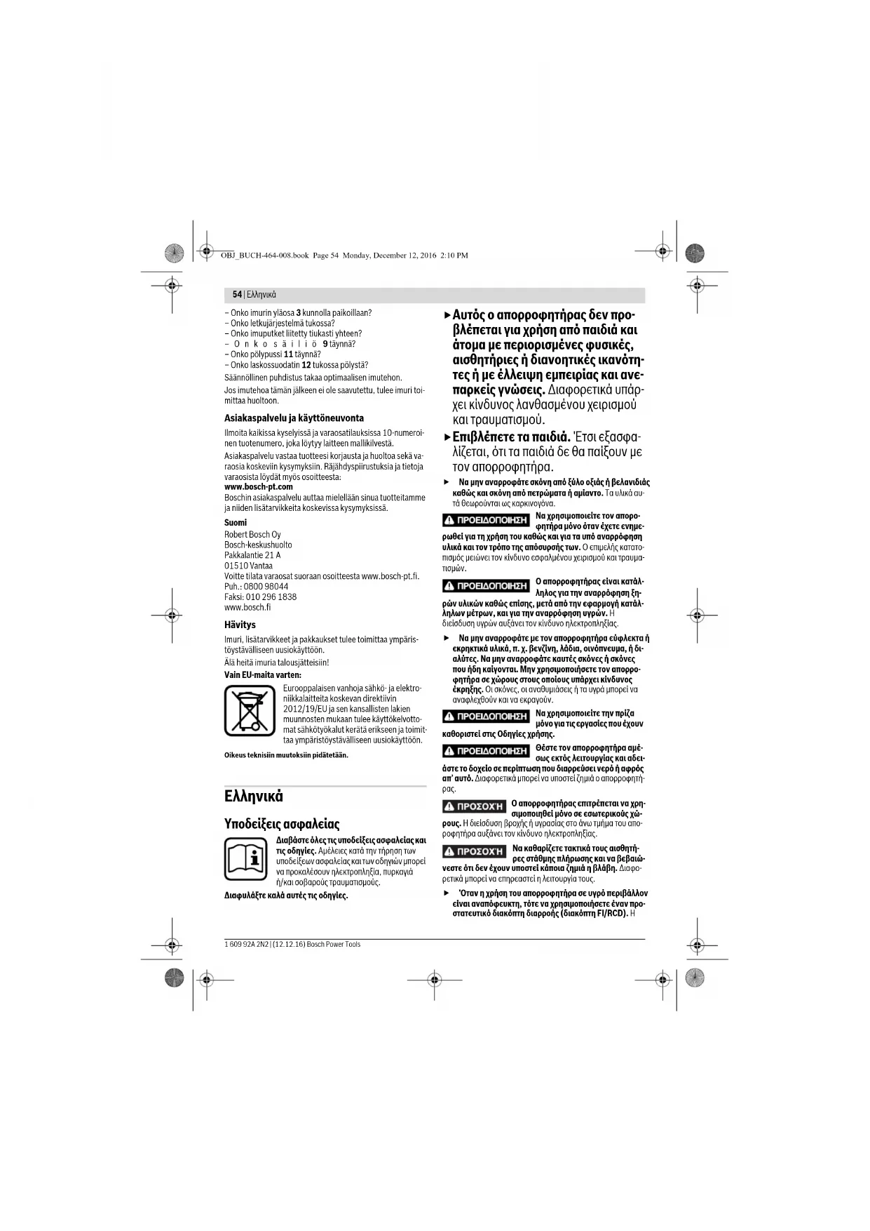 OBJ_BUCH-464-008.book Page 58 Monday, December 12, 2016 2:10 PMTürkçe | 59Bosch Power Tools 1 609 92A 2N2 | (12.12.16) Απόσυρση Ο απορροφητήρας, τα εξαρτήματα και οι συσκευασίες πρέπει να ανακυκλώνονται με τρόπο φιλικό προς το περιβάλλον.Μην ρίξετε τον απορροφητήρα στα απορρίμματα του σπιτιού σας! Μόνο για χώρες της ΕΕ:Σύμφωνα με την Κοινοτική Οδηγία 2012/19/EE σχετικά με τις παλαιές ηλεκτρι-κές και ηλεκτρονικές συσκευές και τη μετα-φορά της οδηγίας αυτής σε εθνικό δίκαιο δεν είναι πλέον υποχρεωτικό τα άχρηστα ηλεκτρι-κά εργαλεία να συλλέγονται ξεχωριστά για να ανακυκλωθούν με τρόπο φιλικό προς το περι-βάλλον.Τηρούμε το δικαίωμα αλλαγών. Türkçe