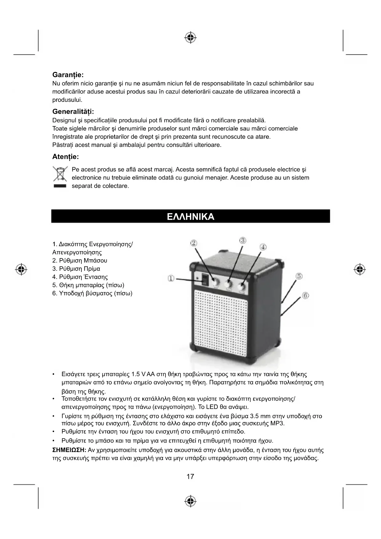 - Αφαιρείτε τις άδειες μπαταρίες από τη συσκευή Τροφοδοσία: DC 4.5V Οδηγίες ασφαλείας: Για να μειώσετε τον κίνδυνο ηλεκτροπληξίας, το προϊόν αυτό θα πρέπει να ανοιχθεί ΜΟΝΟ από εξουσιοδοτημένο τεχνικό όταν απαιτείται συντήρηση (σέρβις). Αποσυνδέστε το προϊόν από την πρίζα και άλλο εξοπλισμό αν παρουσιαστεί πρόβλημα. Μην εκθέτετε το προϊόν σε νερό ή υγρασία.