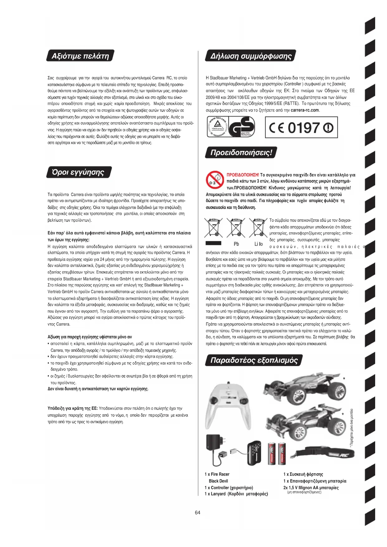 - Rengør RC-køret øjet efter brugen. Den aktuelste version af denne betjeningsvejledni ng og informationer om tilgængelige reservedele finde r du på carrera-rc.com i serviceområd e t. De to joysticks er aftagelige. Alternativt kan køretøjet styres med styrevipperne. Joystickene kan opbevares i det dertil beregnede rum på bagsiden af control- leren. Fastgør bærebåndet med karabinha- gen i øjet på controlleren og hæng den om halsen. Advarsler! Strangulationsfare!64 Αξιότιμε πελάτη Σας συγχαίρουμε για την αγορά του αυτοκινήτου μοντελισμού Carrera RC, το οποίο κατασκευάστηκε σύμφωνα με το τελευταίο επίπεδο της τεχνολογίας. Επειδή προσπα- θούμε πάντοτε να βελτιώνουμε την εξέλιξη και ανάπτυξη των προϊόντων μας, επιφυλασ- σόμαστε για τυχόν τεχνικές αλλαγές στον εξοπλισμό, στα υλικά και στο σχέδιο του ελικο- πτέρου οποιαδήποτε στιγμή και χωρίς καμία προειδοποίηση. Μικρές αποκλίσεις του αγορασθέντος προϊόντος από τα στοιχεία και τις φωτογραφίες αυτών των οδηγιών σε καμία περίπτωση δεν μπορούν να θεμελιώσουν αξιώσεις οποιασδήποτε μορφής. Αυτές οι οδηγίες χρήσης και συναρμολόγησης αποτελούν αναπόσπαστο συμπλήρωμα του προϊό- ντος. Η εγγύηση παύει να ισχύει αν δεν τηρηθούν οι οδηγίες χρήσης και οι οδηγίες ασφα- λείας που περιέχονται σε αυτές. Φυλάξτε αυτές τις οδηγίες για να μπορείτε να τις διαβά- σετε αργότερα και να τις παραδώσετε μαζί με το μοντέλο σε τρίτους. Όροι εγγύησης Τα προϊόντα Carrera είναι προϊόντα υψηλής ποιότητας και τεχνολογίας, τα οποία πρέπει να αντιμετωπίζονται με ιδιαίτερη φροντίδα. Προσέχετε απαραιτήτως τις υπο- δείξεις στις οδηγίες χρήσης. Όλα τα τεμάχια ελέγχονται διεξοδικά (με την επιφύλαξη για τεχνικές αλλαγές και τροποποιήσεις στα μοντέλα, οι οποίες αποσκοπούν στη βελτίωση των προϊόντων). Εάν παρ‘ όλα αυτά εφανιστεί κάποια βλάβη, αυτή καλύπτεται στα πλαίσια των όρων της εγγύησης: Η εγγύηση καλύπτει αποδεδειγμένα ελαττώματα των υλικών ή κατασκευαστικά ελαττώματα, τα οποία υπήρχαν κατά τη στιγμή της αγοράς του προϊόντος Carrera. Η προθεσμία εγγύησης ισχύει για 24 μήνες από την ημερομηνία πώλησης. Η εγγύηση δεν καλύπτει ανταλλακτικά, ζημιές εξαιτίας μη ενδεδειγμένου χειρισμού/χρήσης ή εξαιτίας επεμβάσεων τρίτων. Επισκευές επιτρέπεται να εκτελούνται μόνο από την εταιρεία Stadlbauer Marketing + Vertrieb GmbH ή από εξουσιοδοτημένη εταιρεία. Στο πλαίσιο της παρούσας εγγύησης και κατ‘ επιλογή της Stadlbauer Marketing + Vertrieb GmbH το προϊόν Carrera αντικαθίσταται ως σύνολο ή αντικαθίστανται μόνο τα ελαττωματικά εξαρτήματα ή διασφαλίζεται αντικατάσταση ίσης αξίας. Η εγγύηση δεν καλύπτει τα έξοδα μεταφοράς, συσκευασίας και διαδρομής, καθώς και τις ζημιές που έγιναν από τον αγοραστή. Την ευθύνη για τα παραπάνω φέρει ο αγοραστής. Αξιώσεις για εγγύηση μπορεί να εγείρει αποκλειστικά ο πρώτος κάτοχος του προϊό- ντος Carrera. Αξίωση για παροχή εγγύησης υφίσταται όνο αν