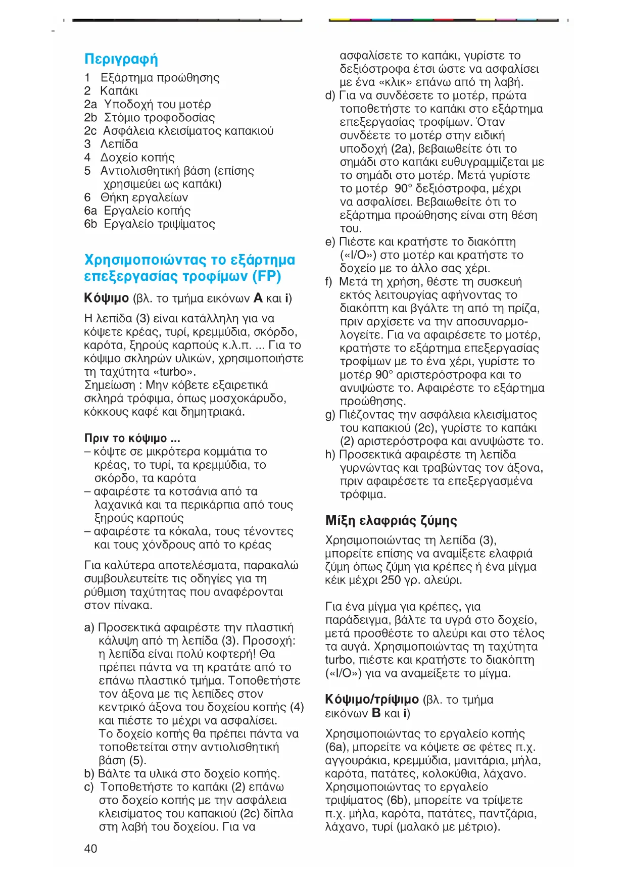 1 Εξάρτημα προώθησης 2 Καπάκι 2a Υποδοχή του μοτέρ 2b Στόμιο τροφοδοσίας 2c Ασφάλεια κλεισίματος καπακιού 3 Λεπίδα 4 ∆οχείο κοπής 5 Αντιολισθητική βάση (επίσης χρησιμεύει ως καπάκι) 6 Θήκη εργαλείων 6a Εργαλείο κοπής 6b Εργαλείο τριψίματος Χρησιμοποιώντας το εξάρτημα επεξεργασίας τροφίμων (FP) Κόψιμο (βλ. το τμήμα εικόνων A και i) Η λεπίδα (3) είναι κατάλληλη για να κόψετε κρέας, τυρί, κρεμμύδια, σκόρδο, καρότα, ξηρούς καρπούς κ.λ.π. ... Για το κόψιμο σκληρών υλικών, χρησιμοποιήστε τη ταχύτητα «turbo». Σημείωση : Μην κόβετε εξαιρετικά σκληρά τρόφιμα, όπως μοσχοκάρυδο, κόκκους καφέ και δημητριακά. Πριν το κόψιμο ... – κόψτε σε μικρότερα κομμάτια το κρέας, το τυρί, τα κρεμμύδια, το σκόρδο, τα καρότα – αφαιρέστε τα κοτσάνια από τα λαχανικά και τα περικάρπια από τους ξηρούς καρπούς – αφαιρέστε τα κόκαλα, τους τένοντες και τους χόνδρους από το κρέας Για καλύτερα αποτελέσματα, παρακαλώ συμβουλευτείτε τις οδηγίες για τη ρύθμιση ταχύτητας που αναφέρονται στον πίνακα. a) Προσεκτικά αφαιρέστε την πλαστική κάλυψη από τη λεπίδα (3). Προσοχή: η λεπίδα είναι πολύ κοφτερή! Θα πρέπει πάντα να τη κρατάτε από το επάνω πλαστικό τμήμα. Τοποθετήστε τον άξονα με τις λεπίδες στον κεντρικό άξονα του δοχείου κοπής (4) και πιέστε το μέχρι να ασφαλίσει. Το δοχείο κοπής θα πρέπει πάντα να τοποθετείται στην αντιολισθητική βάση (5). b) Βάλτε τα υλικά στο δοχείο κοπής. c) Τοποθετήστε το καπάκι (2) επάνω στο δοχείο κοπής με την ασφάλεια κλεισίματος του καπακιού (2c) δίπλα στη λαβή του δοχείου. Για να ασφαλίσετε το καπάκι, γυρίστε το δεξιόστροφα έτσι ώστε να ασφαλίσει με ένα «κλικ» επάνω από τη λαβή. d) Για να συνδέσετε το μοτέρ, πρώτα τοποθετήστε το καπάκι στο εξάρτημα επεξεργασίας τροφίμων. Όταν συνδέετε το μοτέρ στην ειδική υποδοχή (2a), βεβαιωθείτε ότι το σημάδι στο καπάκι ευθυγραμμίζεται με το σημάδι στο μοτέρ. Μετά γυρίστε το μοτέρ 90° δεξιόστροφα, μέχρι να ασφαλίσει. Βεβαιωθείτε ότι το εξάρτημα προώθησης είναι στη θέση