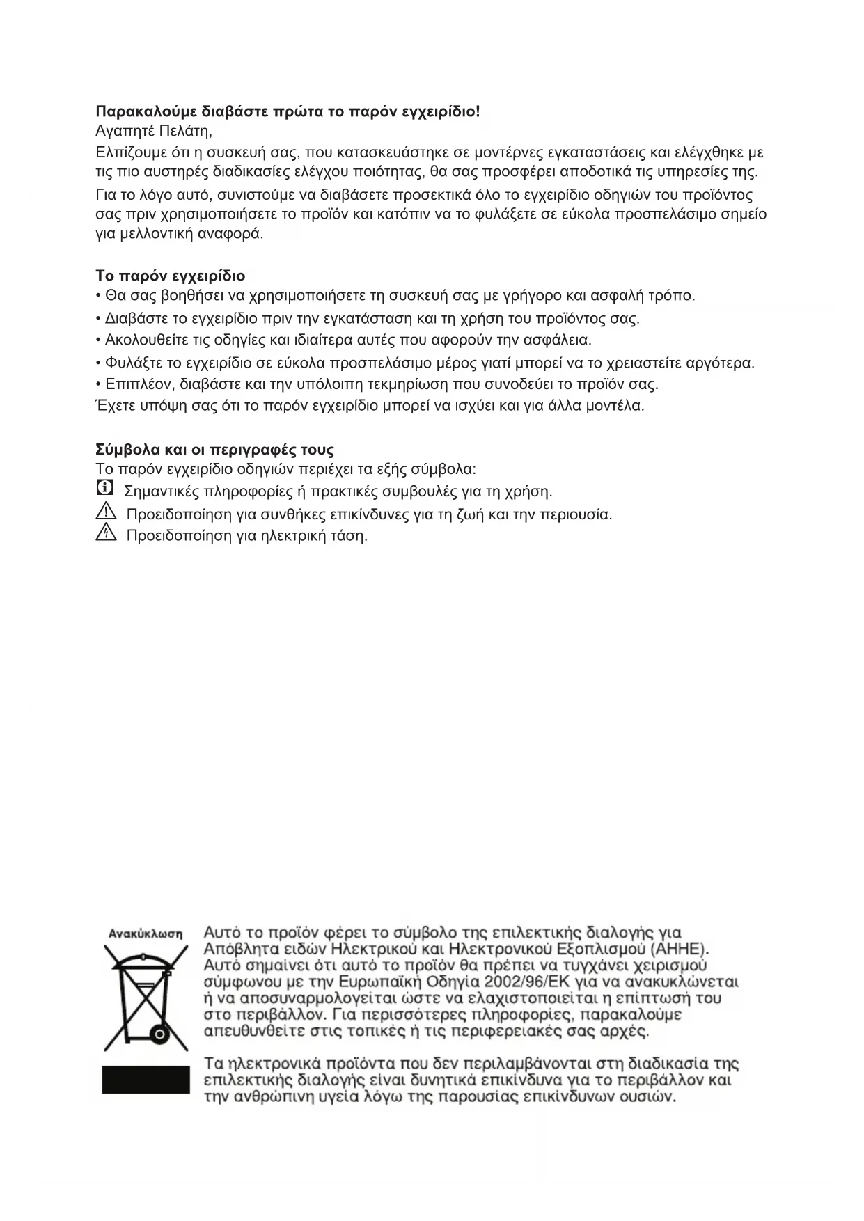 • Φυλάξτε το εγχειρίδιο σε εύκολα προσπελάσιμο μέρος γιατί μπορεί να το χρειαστείτε αργότερα.