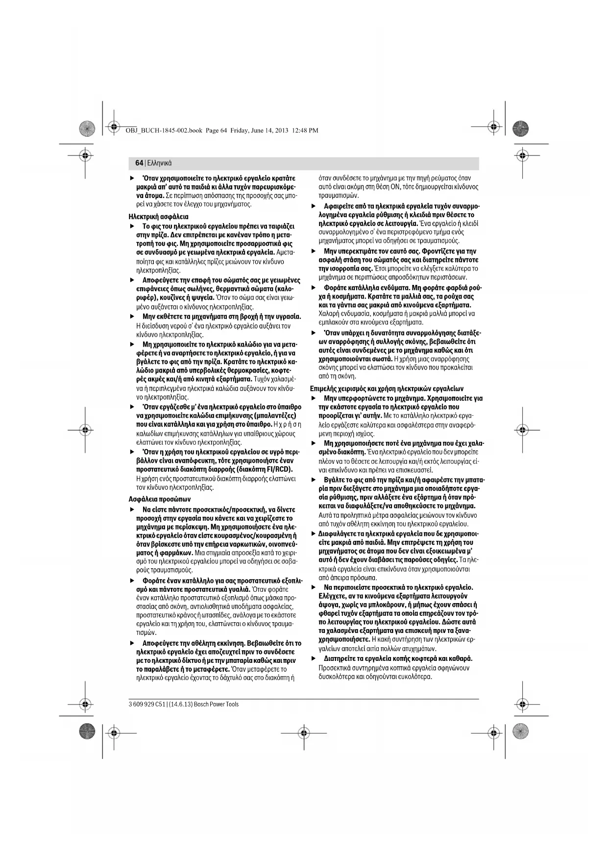 Διαβάστε όλες τις υποδείξεις ασφαλείας και τις οδηγίες. Αμέ- λειες κατά την τήρηση των υποδείξεων ασφαλείας και των οδη- γιών μπορεί να προκαλέσουν ηλεκτροπληξία, πυρκαγιά ή/και σοβαρούς τραυματισμούς. Φυλάξτε όλες τις προειδοποιητικές υποδείξεις και οδηγίες για κάθε μελλοντική χρήση. Ο ορισμός «Ηλεκτρικό εργαλείο» που χρησιμοποιείται στις προ- ειδοποιητικές υποδείξεις αναφέρεται σε ηλεκτρικά εργαλεία που τροφοδοτούνται από το ηλεκτρικό δίκτυο (με ηλεκτρικό κα- λώδιο) καθώς και σε ηλεκτρικά εργαλεία που τροφοδοτούνται από μπαταρία (χωρίς ηλεκτρικό καλώδιο). Ασφάλεια στο χώρο εργασίας Διατηρείτε τον τομέα που εργάζεσθε καθαρό και καλά φωτισμένο. Αταξία ή σκοτεινές περιοχές εργασίας μπορεί να οδηγήσουν σε ατυχήματα. Μην εργάζεσθε με το ηλεκτρικό εργαλείο σε περιβάλ- λον όπου υπάρχει κίνδυνος έκρηξης, στο οποίο υπάρ- χουν εύφλεκτα υγρά, αέρια ή σκόνες. Τα ηλεκτρικά εργα- λεία δημιουργούν σπινθηρισμό ο οποίος μπορεί να αναφλέ- ξει τη σκόνη ή τις αναθυμιάσεις. OBJ_BUCH-1845-002.book Page 63 Friday, June 14, 2013 12:48 PM64 | Ελληνικά 3 609 929 C51 | (14.6.13) Bosch Power Tools Όταν χρησιμοποιείτε το ηλεκτρικό εργαλείο κρατάτε μακριά απ’ αυτό τα παιδιά κι άλλα τυχόν παρευρισκόμε- να άτομα. Σε περίπτωση απόσπασης της προσοχής σας μπο- ρεί να χάσετε τον έλεγχο του μηχανήματος. Ηλεκτρική ασφάλεια Το φις του ηλεκτρικού εργαλείου πρέπει να ταιριάζει στην πρίζα. Δεν επιτρέπεται με κανέναν τρόπο η μετα- τροπή του φις. Μη χρησιμοποιείτε προσαρμοστικά φις σε συνδυασμό με γειωμένα ηλεκτρικά εργαλεία. Αμετα- ποίητα φις και κατάλληλες πρίζες μειώνουν τον κίνδυνο ηλεκτροπληξίας. Αποφεύγετε την επαφή του σώματός σας με γειωμένες επιφάνειες όπως σωλήνες, θερμαντικά σώματα (καλο- ριφέρ), κουζίνες ή ψυγεία. Όταν το σώμα σας είναι γειω- μένο αυξάνεται ο κίνδυνος ηλεκτροπληξίας. Μην εκθέτετε τα μηχανήματα στη βροχή ή την υγρασία. Η διείσδυση νερού σ’ ένα ηλεκτρικό εργαλείο αυξάνει τον κίνδυνο ηλεκτροπληξίας. Μη χρησιμοποιείτε το ηλεκτρικό καλώδιο για να μετα- φέρετε ή να αναρτήσετε το ηλεκτρικό εργαλείο, ή για να βγάλετε το φις από την πρίζα. Κρατάτε το ηλεκτρικό κα- λώδιο μακριά από υπερβολικές θερμοκρασίες, κοφτε- ρές ακμές και/ή από κινητά εξαρτήματα. Τυχόν χαλασμέ- να ή περιπλεγμένα ηλεκτρικά καλώδια αυξάνουν τον κίνδυ- νο ηλεκτροπληξίας. Όταν εργάζεσθε μ’ ένα ηλεκτρικό εργαλείο στο ύπαιθρο να χρησιμοποιείτε καλώδια επιμήκυνσης (μπαλαντέζες) που είναι κατάλληλα και για χρήση στο ύπαιθρο. Ηχρήση καλωδίων επιμήκυνσης κατάλληλων για υπαίθριους χώρους ελαττώνει τον κίνδυνο ηλεκτροπληξίας. Όταν η χρήση του ηλεκτρικού εργαλείου σε υγρό περι- βάλλον είναι αναπόφευκτη, τότε χρησιμοποιήστε έναν προστατευτικό διακόπτη διαρροής (διακόπτη FI/RCD). Η χρήση ενός προστατευτικού διακόπτη διαρροής ελαττώνει τον κίνδυνο ηλεκτροπληξίας. Ασφάλεια προσώπων Να είστε πάντοτε προσεκτικός/προσεκτική, να δίνετε προσοχή στην εργασία που κάνετε και να χειρίζεστε το μηχάνημα με περίσκεψη. Μη χρησιμοποιήσετε ένα ηλε- κτρικό εργαλείο όταν είστε κουρασμένος/κουρασμένη ή όταν βρίσκεστε υπό την επήρεια ναρκωτικών, οινοπνεύ- ματος ή φαρμάκων. Μια στιγμιαία απροσεξία κατά το χειρι- σμό του ηλεκτρικού εργαλείου μπορεί να οδηγήσει σε σοβα- ρούς τραυματισμούς. Φοράτε έναν κατάλληλο για σας προστατευτικό εξοπλι- σμό και πάντοτε προστατευτικά γυαλιά. Όταν φοράτε έναν κατάλληλο προστατευτικό εξοπλισμό όπως μάσκα προ- στασία
