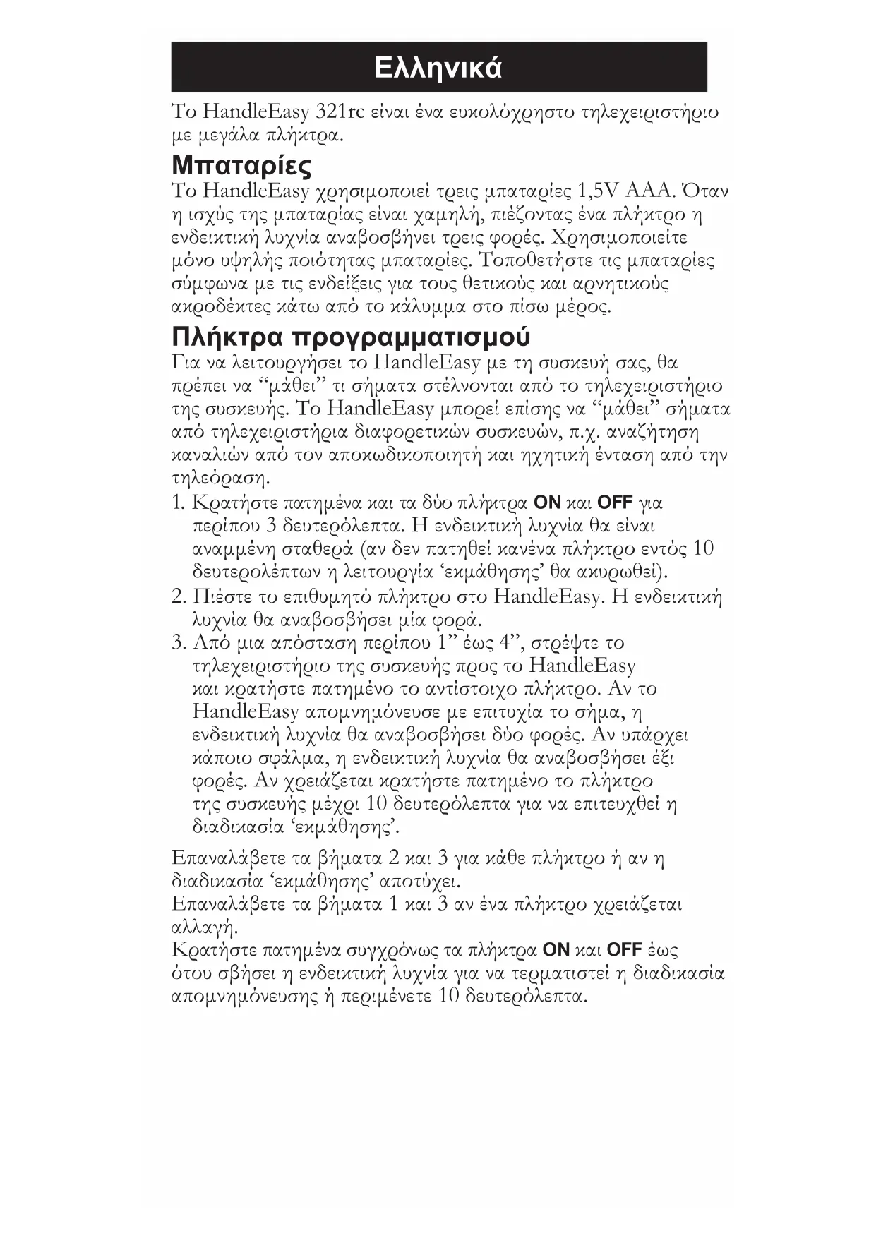 συσκευής. Αν το HandleEasy απομνημόνευσε με επιτυχία το σήμα, η ενδεικτική λυχνία θα αναβοσβήσει δύο φορές. Τώρα το HandleEasy απομνημόνευσε το διπλό σήμα. Επαναλάβετε τα βήματα 2 έως 5 για κάθε πλήκτρο χρησιμοποιώντας διπλό σήμα ή αν η διαδικασία ‘εκμάθησης’ αποτύχει. Τώρα το HandleEasy είναι έτοιμο για λειτουργία. Κρατήστε πατημένα συγχρόνως τα πλήκτρα ON και OFF ή περιμένετε 10 δευτερόλεπτα για να τερματιστεί η λειτουργία εκμάθησης.Αντιμετώπιση προβλημάτων Αν το HandleEasy λειτουργεί μόνο διακεκομμένα ή μεταπηδάει διπλά βήματα, πρέπει να το προγραμματίσετε για να χρησιμοποιεί διπλό σήμα. Κατά τον προγραμματισμό διπλού σήματος, δύο διαδοχικές διαδικασίες εκμάθησης ανά πλήκτρο πρέπει να είναι επιτυχείς. Αν η διαδικασία εκμάθησης αποτύχει μετά από επανειλημμένες προσπάθειες: