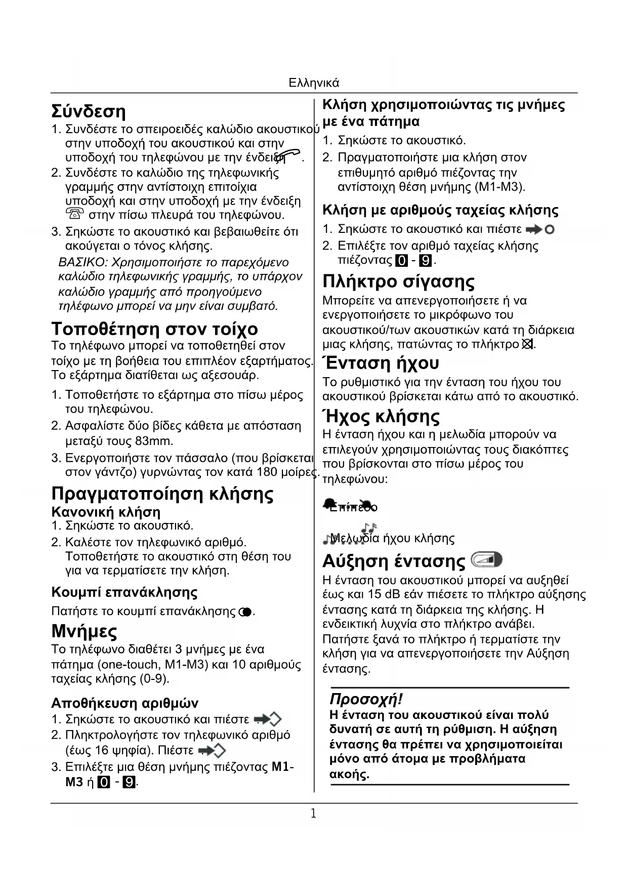 στην πίσω πλευρά του τηλεφώνου. Σηκώστε το ακουστικό και βεβαιωθείτε ότι ακούγεται ο τόνος κλήσης. ΒΑΣΙΚΟ: Χρησιμοποιήστε το παρεχόμενο καλώδιο τηλεφωνικής γραμμής, το υπάρχον καλώδιο γραμμής από προηγούμενο τηλέφωνο μπορεί να μην είναι συμβατό. Τοποθέτηση στον τοίχο Το τηλέφωνο μπορεί να τοποθετηθεί στον τοίχο με τη βοήθεια του επιπλέον εξαρτήματος. Το εξάρτημα διατίθεται ως αξεσουάρ. Τοποθετήστε το εξάρτημα στο πίσω μέρος του τηλεφώνου. Ασφαλίστε δύο βίδες κάθετα με απόσταση μεταξύ τους 83mm. Ενεργοποιήστε τον πάσσαλο (που βρίσκεται στον γάντζο) γυρνώντας τον κατά 180 μοίρες. Πραγματοποίηση κλήσης Κανονική κλήση Σηκώστε το ακουστικό. Καλέστε τον τηλεφωνικό αριθμό. Τοποθετήστε το ακουστικό στη θέση του για να τερματίσετε την κλήση. Κουμπί επανάκλησης Πατήστε το κουμπί επανάκλησης