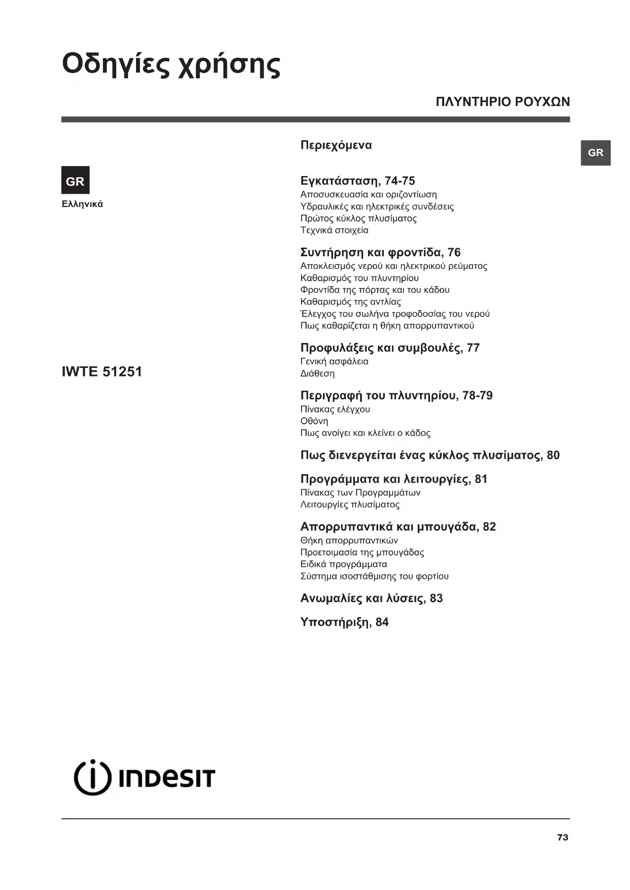 Εγκατάσταση, 74-75 Αποσυσκευασία και οριζοντίωσηΥδραυλικές και ηλεκτρικές συνδέσειςΠρώτος κύκλος πλυσίματοςΤεχνικά στοιχεία Συντήρηση και φροντίδα, 76 Αποκλεισμός νερού και ηλεκτρικού ρεύματοςΚαθαρισμός του πλυντηρίουΦροντίδα της πόρτας και του κάδουΚαθαρισμός της αντλίαςΈλεγχος του σωλήνα τροφοδοσίας του νερού Πως καθαρίζεται η θήκη απορρυπαντικού Προφυλάξεις και συμβουλές, 77 Γενική ασφάλειαΔιάθεση Περιγραφή του πλυντηρίου, 78-79 Πίνακας ελέγχουΟθόνη Πως ανοίγει και κλείνει ο κάδος Πως διενεργείται ένας κύκλος πλυσίματος, 80
