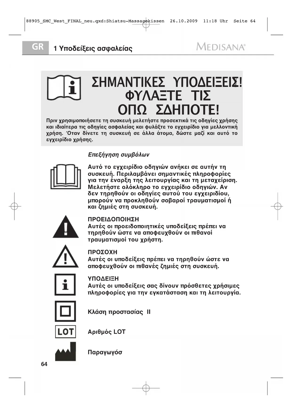 ΣΗΜΑΝΤΙΚΕΣ ΥΠΟΔΕΙΞΕΙΣ! ΦΥΛΑΞΤΕ ΤΙΣ ΟΠΩ ΣΔΗΠΟΤΕ! Αυτό το εγχειρίδιο οδηγιών ανήκει σε αυτήν τησυσκευή. Περιλαμβάνει σημαντικές πληροφορίες για την έναρξη της λειτουργίας και τη μεταχείριση.Μελετήστε ολόκληρο το εγχειρίδιο οδηγιών. Αν δεν τηρηθούν οι οδηγίες αυτού του εγχειριδίου,μπορούν να προκληθούν σοβαροί τραυματισμοί ή και ζημιές στη συσκευή.ΠΡΟΕΙΔΟΠΟΙΗΣΗΑυτές οι προειδοποιητικές υποδείξεις πρέπει νατηρηθούν ώστε να αποφευχθούν οι πιθανοίτραυματισμοί του χρήστη.ΠΡΟΣΟΧΗΑυτές οι υποδείξεις πρέπει να τηρηθούν ώστε νααποφευχθούν οι πιθανές ζημιές στη συσκευή.ΥΠΟΔΕΙΞΗΑυτές οι υποδείξεις σας δίνουν πρόσθετες χρήσιμες πληροφορίες για την εγκατάσταση και τη λειτουργία.∫Ï¿ÛË ÚÔÛÙ·Û›·˜ IIΑριθμός LOT¶·Ú·ÁˆÁfiÛΠριν χρησιμοποιήσετε τη συσκευή μελετήστε προσεκτικά τις οδηγίες χρήσηςκαι ιδιαίτερα τις οδηγίες ασφαλείας και φυλάξτε το εγχειρίδιο για μελλοντικήχρήση. Όταν δίνετε τη συσκευή σε άλλα άτομα, δώστε μαζί και αυτό τοεγχειρίδιο χρήσης. Επεξήγηση συμβόλων 88905_SMC_West_FINAL_neu.qxd:Shiatsu-Massagekissen 26.10.2009 11:18 Uhr Seite 6465