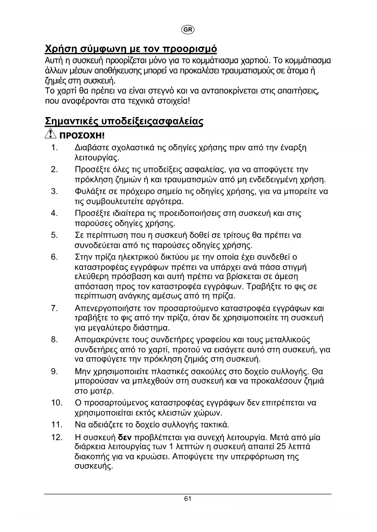 Αυτή η συσκευή προορίζεται μόνο για το κομμάτιασμα χαρτιού. Το κομμάτιασμα