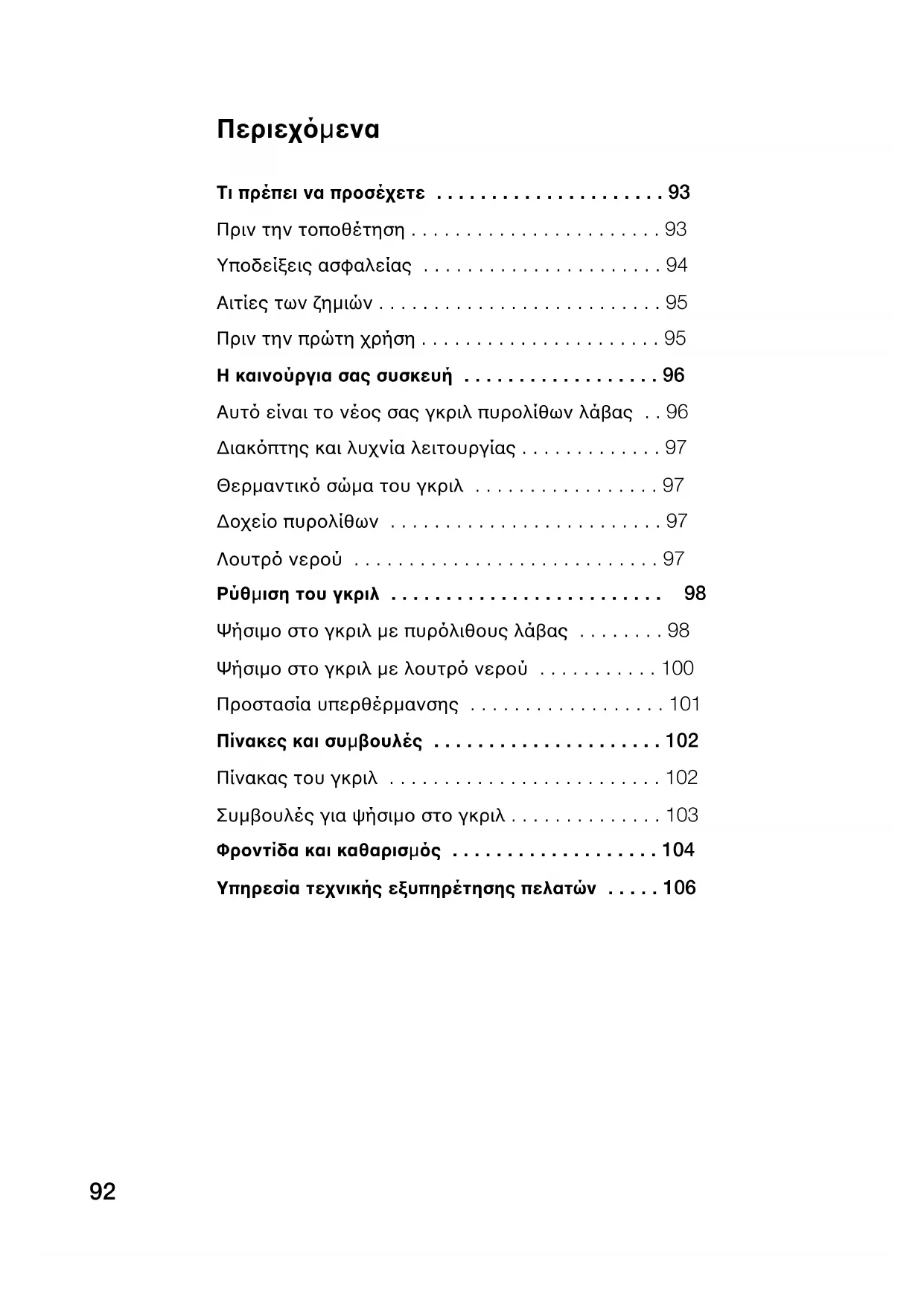 Ρύθμιση του γκριλ . . . . . . . . . . . . . . . . . . . . . . . . . 98