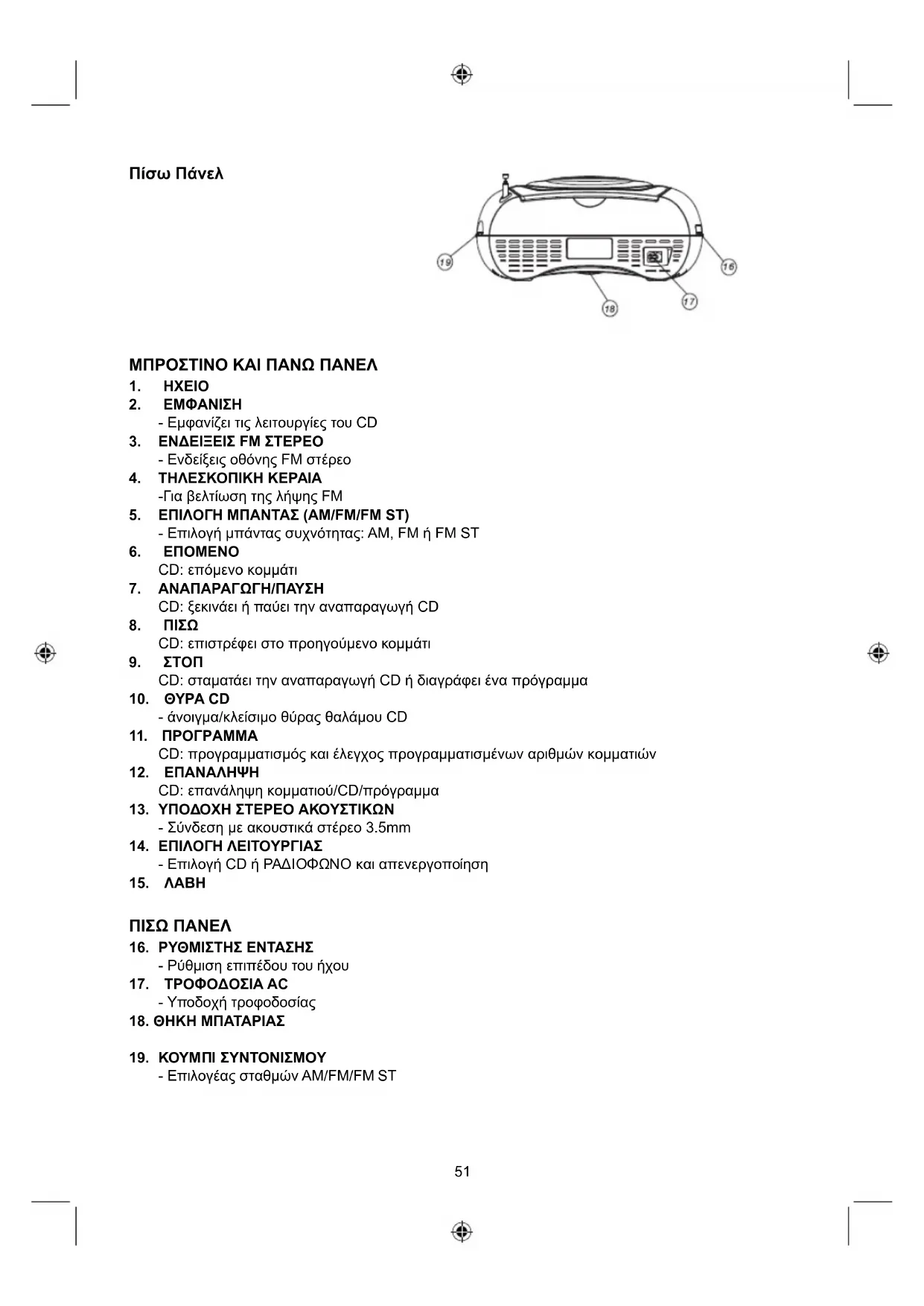 - Συνδεοτε TO καλωδιο πεύματος ΟΟ τραδίοφωνo/CD player και στη συνέχεια συνδεοτε TO στην πρίζα. H πρίζα πρέπειν α εἰναι κοντά στο τραδίοφωνo/CD player και ν εἰναι εύκολα προσβάσιμη. Γιαν α τηνεργοτοιησετε TO ραδίοφωνo/CD player, ατοσυνδεοτε TO καλωδιο tροφόδοσιας από την πρίζα.