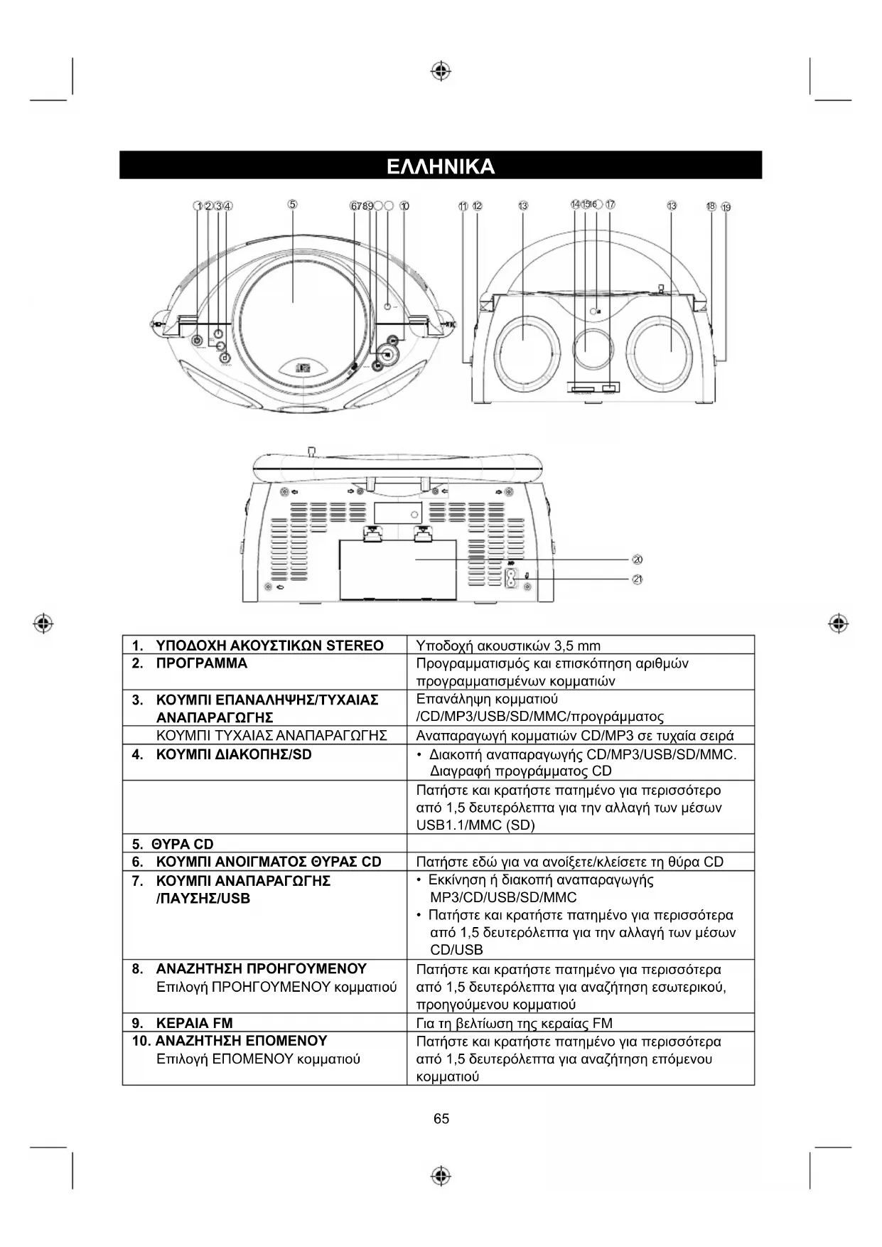| 4. KOYMΠΙ ΔΙΑΚΟΝΗΣ/SD | • Διακοπήναναπαρayωγής CD/MP3/USB/SD/MMC. Διαγραφήνρογαματος CD |