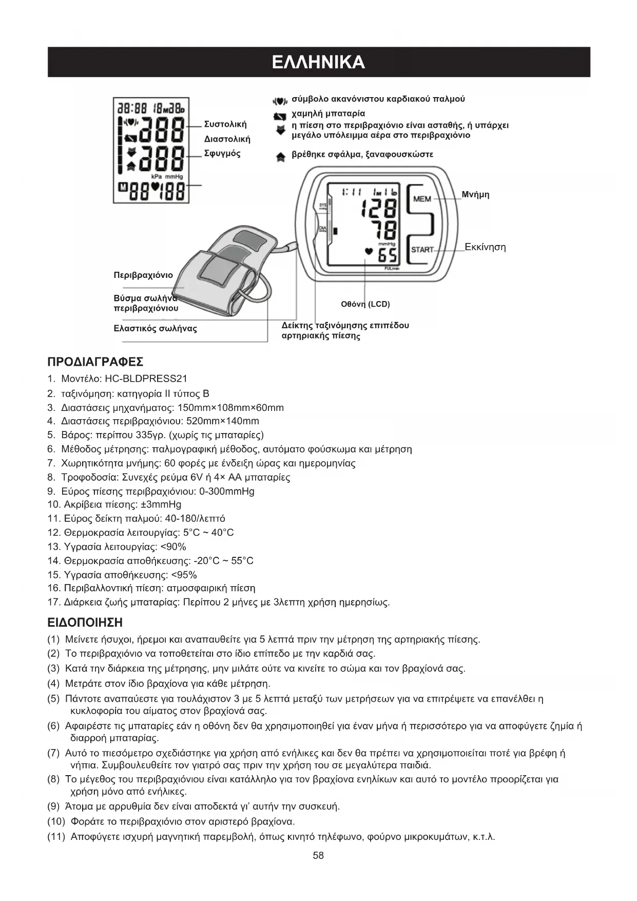 (1) Μείνετε ήσυχοι, ήρεμοι και αναπαυθείτε για 5 λεπτά πριν την μέτρηση της αρτηριακής πίεσης. (2) Το περιβραχιόνιο να τοποθετείται στο ίδιο επίπεδο με την καρδιά σας. (3) Κατά την διάρκεια της μέτρησης, μην μιλάτε ούτε να κινείτε το σώμα και τον βραχίονά σας. (4) Μετράτε στον ίδιο βραχίονα για κάθε μέτρηση. (5) Πάντοτε αναπαύεστε για τουλάχιστον 3 με 5 λεπτά μεταξύ των μετρήσεων για να επιτρέψετε να επανέλθει η κυκλοφορία του αίματος στον βραχίονά σας. (6) Αφαιρέστε τις μπαταρίες εάν η οθόνη δεν θα χρησιμοποιηθεί για έναν μήνα ή περισσότερο για να αποφύγετε ζημία ή διαρροή μπαταρίας. (7) Αυτό το πιεσόμετρο σχεδιάστηκε για χρήση από ενήλικες και δεν θα πρέπει να χρησιμοποιείται ποτέ για βρέφη ή νήπια. Συμβουλευθείτε τον γιατρό σας πριν την χρήση του σε μεγαλύτερα παιδιά. (8) Το μέγεθος του περιβραχιόνιου είναι κατάλληλο για τον βραχίονα ενηλίκων και αυτό το μοντέλο προορίζεται για χρήση μόνο από ενήλικες. (9) Άτομα με αρρυθμία δεν είναι αποδεκτά γι’ αυτήν την συσκευή. (10) Φοράτε το περιβραχιόνιο στον αριστερό βραχίονα. (11) Αποφύγετε ισχυρή μαγνητική παρεμβολή, όπως κινητό τηλέφωνο, φούρνο μικροκυμάτων, κ.τ.λ.59 ΔΙΑΔΙΚΑΣΙΕΣ ΡΥΘΜΙΣΗΣ ΚΑΙ ΛΕΙΤΟΥΡΓΙΑΣ