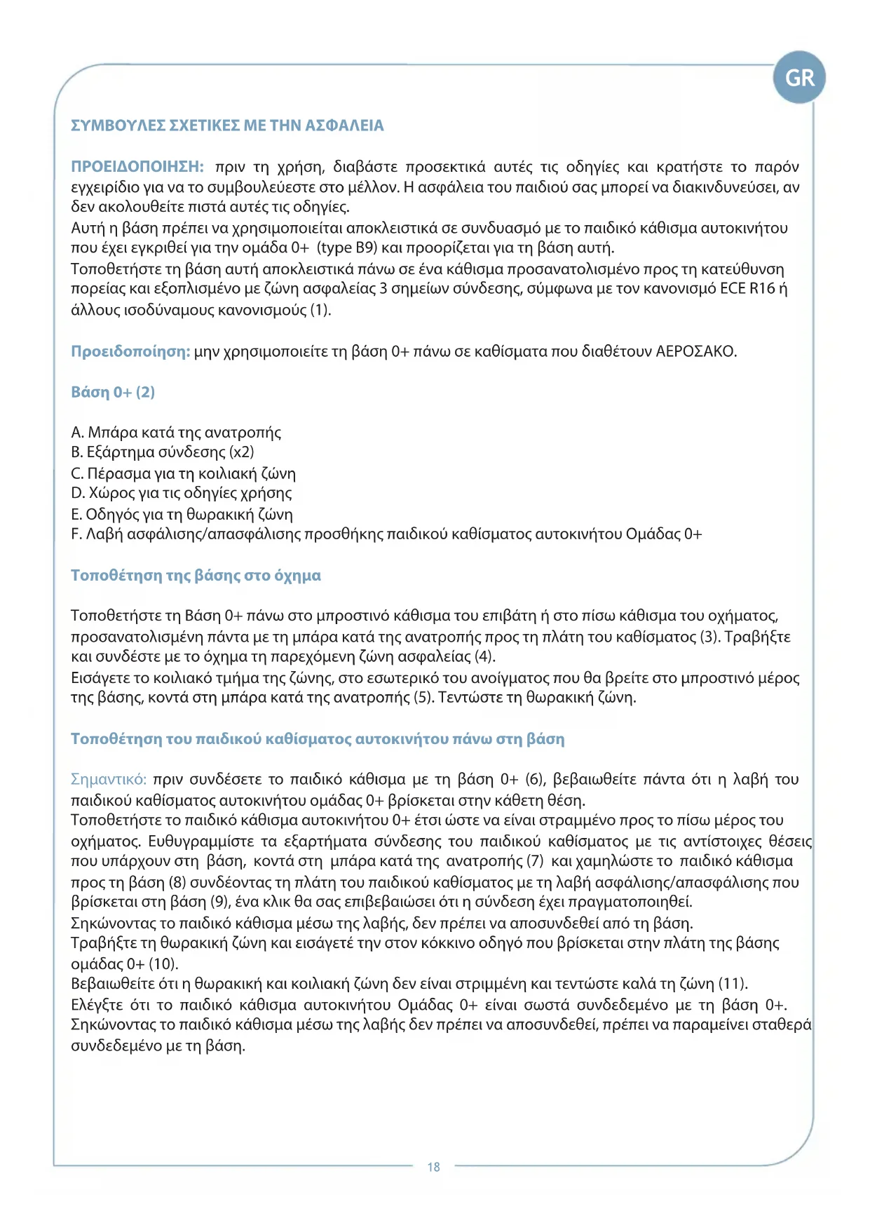 Gebruikshandleiding De gebruikshandleiding bewaren in de behuizing die zich in het centrum van de basis bevindt (14), dit om de handleiding te kunnen raadplegen indien nodig. Bijkomende inlichtingen De gebruikshandleiding van het autostoeltje grop 0+ en van de basis 0+ raadplegen voor bijkomende inlichtingen over de installatie en de correcte vasthechting van de basis 0+ en over het vastmaken van het stoeltje aan de basis, over de plaatsing en de vasthechting van het kind en over de correcte regeling van het desbetreffend handvat. Aandachtig de aangegeven waarschuwingen over de producten en de gebruikshandleiding lezen en deze bewaren voor later gebruik. Belangrijk De basis 0+ is gehomologeerd overeenkomstig de norm ECE R44/04, Europese norm m.b.t. de veiligheid van de autostoeltjes, en moet alleen gebruikt worden samen met het autostoeltje Groep 0+ (type B9). Het model van het autostoeltje staat aangeduid op het etiket aangebracht op het product (15). Zorg ervoor dat het basis voor autostoeltje altijd aan de autozitting bevestigd is: het zou anders de passagiers kunnen stoten en verwonden.18 ΣΥΜΒΟΥΛΕΣ ΣΧΕΤΙΚΕΣ ΜΕ ΤΗΝ ΑΣΦΑΛΕΙΑ ΠΡΟΕΙΔΟΠΟΙΗΣΗ: πριν τη χρήση, διαβάστε προσεκτικά αυτές τις οδηγίες και κρατήστε το παρόν εγχειρίδιο για να το συμβουλεύεστε στο μέλλον. Η ασφάλεια του παιδιού σας μπορεί να διακινδυνεύσει, αν δεν ακολουθείτε πιστά αυτές τις οδηγίες. Αυτή η βάση πρέπει να χρησιμοποιείται αποκλειστικά σε συνδυασμό με το παιδικό κάθισμα αυτοκινήτου που έχει εγκριθεί για την ομάδα 0+ (type B9) και προορίζεται για τη βάση αυτή. Τοποθετήστε τη βάση αυτή αποκλειστικά πάνω σε ένα κάθισμα προσανατολισμένο προς τη κατεύθυνση πορείας και εξοπλισμένο με ζώνη ασφαλείας 3 σημείων σύνδεσης, σύμφωνα με τον κανονισμό ECE R16 ή άλλους ισοδύναμους κανονισμούς (1). Προειδοποίηση: μην χρησιμοποιείτε τη βάση 0+ πάνω σε καθίσματα που διαθέτουν ΑΕΡΟΣΑΚΟ. Βάση 0+ (2) A. Μπάρα κατά της ανατροπής B. Εξάρτημα σύνδεσης (x2) C. Πέρασμα για τη κοιλιακή ζώνη D. Χώρος για τις οδηγίες χρήσης E. Οδηγός για τη θωρακική ζώνη F. Λαβή ασφάλισης/απασφάλισης προσθήκης παιδικού καθίσματος αυτοκινήτου Ομάδας 0+ Τοποθέτηση της βάσης στο όχημα Τοποθετήστε τη Βάση 0+ πάνω στο μπροστινό κάθισμα του επιβάτη ή στο πίσω κάθισμα του οχήματος, προσανατολισμένη πάντα με τη μπάρα κατά της ανατροπής προς τη πλάτη του καθίσματος (3). Τραβήξτε και συνδέστε με το όχημα τη παρεχόμενη ζώνη ασφαλείας (4). Εισάγετε το κοιλιακό τμήμα της ζώνης, στο εσωτερικό του ανοίγματος που θα βρείτε στο μπροστινό μέρος της βάσης, κοντά στη μπάρα κατά της ανατροπής (5). Τεντώστε τη θωρακική ζώνη. Τοποθέτηση του παιδικού καθίσματος αυτοκινήτου πάνω στη βάση Σημαντικό: πριν συνδέσετε το παιδικό κάθισμα με τη βάση 0+ (6), βεβαιωθείτε πάντα ότι η λαβή του παιδικού καθίσματος αυτοκινήτου ομάδας 0+ βρίσκεται στην κάθετη θέση. Τοποθετήστε το παιδικό κάθισμα αυτοκινήτου 0+ έτσι ώστε να είναι στραμμένο προς το πίσω μέρος του οχήματος. Ευθυγραμμίστε τα εξαρτήματα σύνδεσης του παιδικού καθίσματος με τις αντίστοιχες θέσεις που υπάρχουν στη βάση, κοντά στη μπάρα κατά της ανατροπής (7) και χαμηλώστε το παιδικό κάθισμα προς τη βάση (8) συνδέοντας τη πλάτη του παιδικού καθίσματος με τη λαβή ασφάλισης/απασφάλισης που βρίσκεται στη βάση (9), ένα κλικ θα σας επιβεβαιώσει ότι η σύνδεση έχει πραγματοποιηθεί. Σηκώνοντας το παιδικό κάθισμα μέσω της λαβής, δεν πρέπει να αποσυνδεθεί από τη βάση. Τραβήξτε τη θωρακική ζώνη και εισάγετέ την στον κόκκινο οδηγό που βρίσκεται στην πλάτη της βάσης ομάδας 0+ (10). Βεβαιωθείτε ότι η θωρακική και κοιλιακή ζώνη δεν είναι στριμμένη και τεντώστε καλά τη ζώνη (11). Ελέγξτε ότι το παιδικό κάθισμα αυτοκινήτου Ομάδας 0+ είναι σωστά συνδεδεμένο με τη βάση 0+. Σηκώνοντας το παιδικό κάθισμα μέσω της λαβής δεν πρέπει να αποσυνδεθεί, πρέπει να παραμείνει σταθερά συνδεδεμένο με τη βάση. GR19