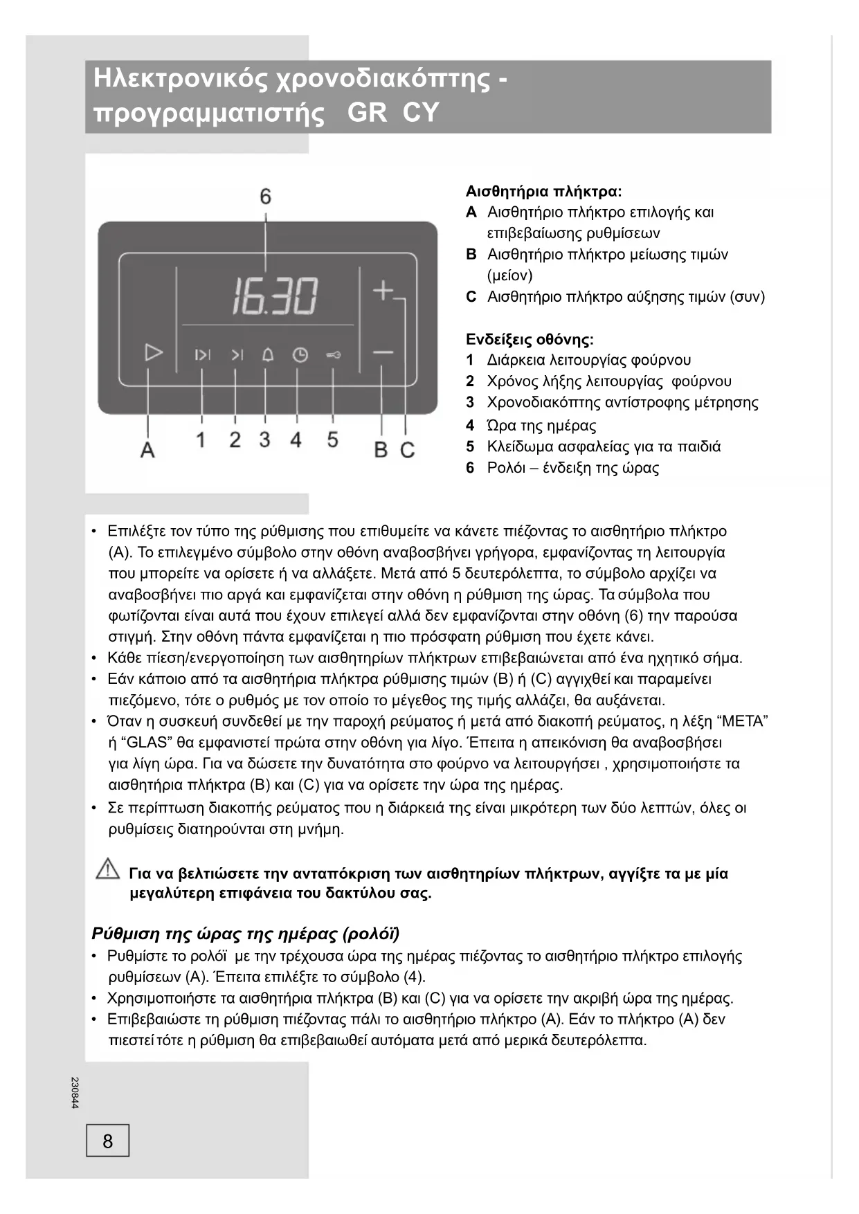 Xpnoiopoioinote ta aioehtnpia TnKtpa (B) kai (C) yia va opioet Tnv akpiñ wpa tnc npεpaç. - Eπiβεβaiωτε ηρuθμιση πίεζοντας πάλι Φισθητήριο πλήκτρο (A). Eav to πλήκτρο (A) δεν πίεστεί τότε η ρuθμιση θα επiβεβaiωθεί αυματα μετα ατό μερικα δειτερόλεπτα.