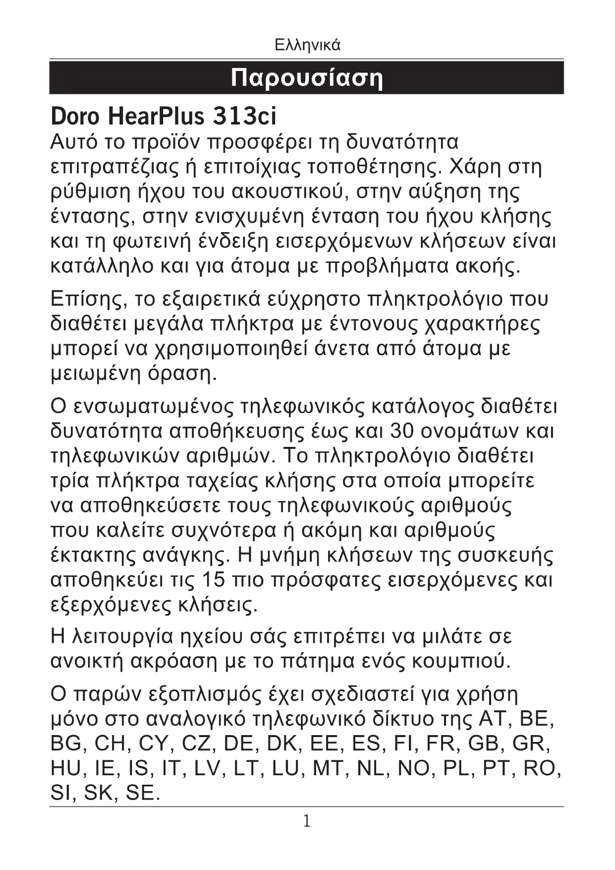 Doro HearPlus 313ci Αυτό το προϊόν προσφέρει τη δυνατότητα επιτραπέζιας ή επιτοίχιας τοποθέτησης. Χάρη στη ρύθμιση ήχου του ακουστικού, στην αύξηση της έντασης, στην ενισχυμένη ένταση του ήχου κλήσης και τη φωτεινή ένδειξη εισερχόμενων κλήσεων είναι κατάλληλο και για άτομα με προβλήματα ακοής. Επίσης, το εξαιρετικά εύχρηστο πληκτρολόγιο που διαθέτει μεγάλα πλήκτρα με έντονους χαρακτήρες μπορεί να χρησιμοποιηθεί άνετα από άτομα με μειωμένη όραση. Ο ενσωματωμένος τηλεφωνικός κατάλογος διαθέτει δυνατότητα αποθήκευσης έως και 30 ονομάτων και τηλεφωνικών αριθμών. Το πληκτρολόγιο διαθέτει τρία πλήκτρα ταχείας κλήσης στα οποία μπορείτε να αποθηκεύσετε τους τηλεφωνικούς αριθμούς που καλείτε συχνότερα ή ακόμη και αριθμούς έκτακτης ανάγκης. Η μνήμη κλήσεων της συσκευής αποθηκεύει τις 15 πιο πρόσφατες εισερχόμενες και εξερχόμενες κλήσεις. Η λειτουργία ηχείου σάς επιτρέπει να μιλάτε σε ανοικτή ακρόαση με το πάτημα ενός κουμπιού. Ο παρών εξοπλισμός έχει σχεδιαστεί για χρήση μόνο στο αναλογικό τηλεφωνικό δίκτυο της AT, BE, BG, CH, CY, CZ, DE, DK, EE, ES, FI, FR, GB, GR, HU, IE, IS, IT, LV, LT, LU, MT, NL, NO, PL, PT, RO, SI, SK, SE.2