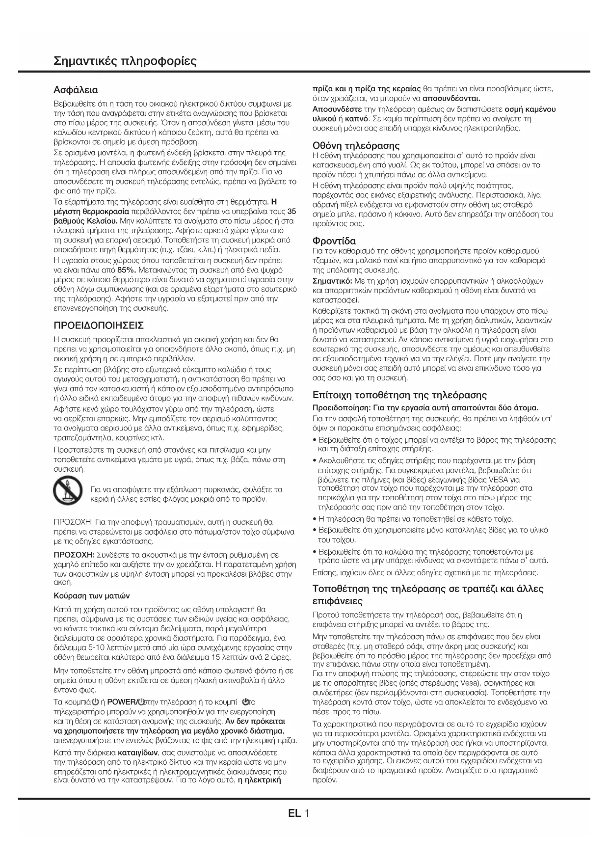 Προτού τοποθετήσετε την τηλεόρασή σας, βεβαιωθείτε ότι η επιφάνεια στήριξης μπορεί να αντέξει το βάρος της. Μην τοποθετείτε την τηλεόραση πάνω σε επιφάνειες που δεν είναι σταθερές (π.χ. μη σταθερό ράφι, στην άκρη μιας συσκευής) και βεβαιωθείτε ότι το πρόσθιο μέρος της τηλεόρασης δεν προεξέχει από την επιφάνεια πάνω στην οποία είναι τοποθετημένη. Για την αποφυγή πτώσης της τηλεόρασης, στερεώστε την στον τοίχο με τις απαραίτητες βίδες (οπές στερέωσης Vesa), σφιγκτήρες και συνδετήρες (δεν περιλαμβάνονται στη συσκευασία). Τοποθετήστε την τηλεόραση κοντά στον τοίχο, ώστε να αποκλείεται το ενδεχόμενο να πέσει προς τα πίσω. Τα χαρακτηριστικά που περιγράφονται σε αυτό το εγχειρίδιο ισχύουν για τα περισσότερα μοντέλα. Ορισμένα χαρακτηριστικά ενδέχεται να μην υποστηρίζονται από την τηλεόρασή σας ή/και να υποστηρίζονται κάποια άλλα χαρακτηριστικά τα οποία δεν περιγράφονται σε αυτό το εγχειρίδιο χρήσης. Οι εικόνες αυτού του εγχειριδίου ενδέχεται να διαφέρουν από το πραγματικό προϊόν. Ανατρέξτε στο πραγματικό προϊόν.EL 2 Πληροφορίες απόρριψης παλιού εξοπλισμού και μπαταριών [Ευρωπαϊκή Ένωση] Αυτά τα σύμβολα υποδεικνύουν ότι οι ηλεκτρικές και ηλεκτρονικές συσκευές και οι μπαταρίες που φέρουν το συγκεκριμένο σύμβολο δεν θα πρέπει να απορρίπτονται μαζί με τα οικιακά απορρίμματα μετά το τέλος της ζωής τους. Αντιθέτως, τα προϊόντα αυτά θα πρέπει να παραδίδονται για ανακύκλωση στα ειδικά σημεία συλλογής ηλεκτρικών και ηλεκτρονικών συσκευών και μπαταριών για κατάλληλη αξιοποίηση και ανακύκλωση σύμφωνα με την εθνική νομοθεσία και τις Οδηγίες 2002/96/ΕΚ και 2006/66/ΕΚ. Απορρίπτοντας σωστά αυτά τα προϊόντα, συμβάλλετε στην προστασία των φυσικών πόρων και την αποφυγή πιθανών αρνητικών επιπτώσεων για το περιβάλλον και την υγεία, οι οποίες θα μπορούσαν να προκληθούν σε περίπτωση ακατάλληλης διαχείρισης αυτών των απορριμμάτων. Για περισσότερες πληροφορίες σχετικά με τα σημεία συλλογής και ανακύκλωσης αυτών των προϊόντων, απευθυνθείτε στο δήμο σας, την υπηρεσία διάθεσης οικιακών απορριμμάτων ή το κατάστημα από το οποίο αγοράσατε το προϊόν. Η ακατάλληλη απόρριψη αυτού του προϊόντος, ενδέχεται να επιφέρει ποινή, ανάλογα με την εθνική νομοθεσία. [Εταιρική χρήση] Εάν επιθυμείτε να απορρίψετε αυτό το προϊόν, απευθυνθείτε στον προμηθευτή σας και ελέγξτε τους όρους και τις προϋποθέσεις της σύμβασης