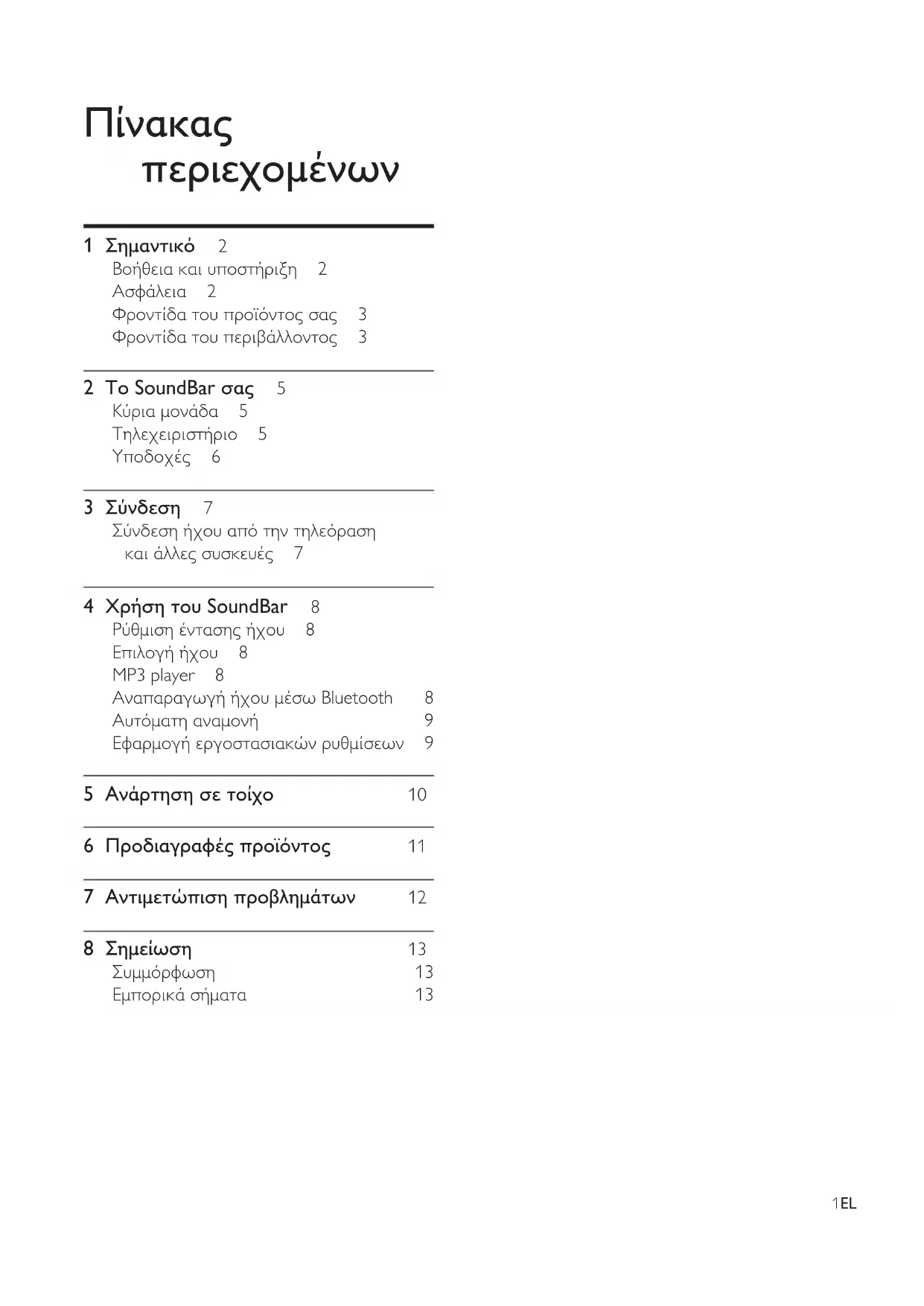 περιεχομένων 1 Σημαντικό 2 Βοήθεια και υποστήριξη 2 Ασφάλεια 2 Φροντίδα του προϊόντος σας 3 Φροντίδα του περιβάλλοντος 3 2 Το SoundBar σας 5 Κύρια μονάδα 5 Τηλεχειριστήριο 5 Υποδοχές 6 3 Σύνδεση 7 Σύνδεση ήχου από την τηλεόραση και άλλες συσκευές 7 4 Χρήση του SoundBar 8 Ρύθμιση έντασης ήχου 8 Επιλογή ήχου 8 MP3 player 8 Αναπαραγωγή ήχου μέσω Bluetooth 8 Αυτόματη αναμονή 9 Εφαρμογή εργοστασιακών ρυθμίσεων 9 5 Ανάρτηση σε τοίχο 10 6 Προδιαγραφές προϊόντος 11 7 Αντιμετώπιση προβλημάτων 12 8 Σημείωση 13 Συμμόρφωση 13 Εμπορικά σήματα 132 EL 1 Σημαντικό Διαβάστε και κατανοήστε όλες τις οδηγίες πριν χρησιμοποιήσετε το προϊόν. Εάν προκληθεί βλάβη λόγω μη τήρησης των οδηγιών, δεν θα ισχύει η εγγύηση. Βοήθεια και υποστήριξη Η Philips προσφέρει εκτεταμένη ηλεκτρονική υποστήριξη. Επισκεφτείτε τη διαδικτυακή τοποθεσία μας στη διεύθυνση www.philips. com/support, για:
