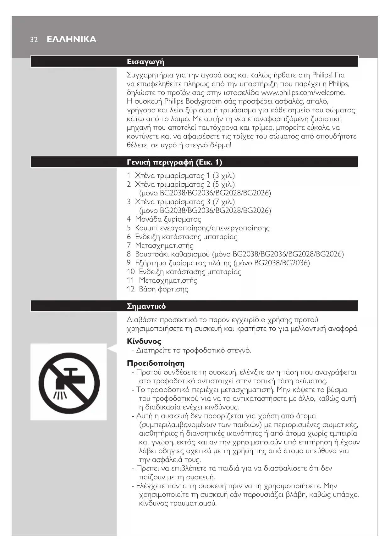 Συγχαρητήρια για την αγορά σας και καλώς ήρθατε στη Philips! Για να επωφεληθείτε πλήρως από την υποστήριξη που παρέχει η Philips, δηλώστε το προϊόν σας στην ιστοσελίδα www.philips.com/welcome. Η συσκευή Philips Bodygroom σάς προσφέρει ασφαλές, απαλό, γρήγορο και λείο ξύρισμα ή τριμάρισμα για κάθε σημείο του σώματος κάτω από το λαιμό. Με αυτήν τη νέα επαναφορτιζόμενη ξυριστική μηχανή που αποτελεί ταυτόχρονα και τρίμερ, μπορείτε εύκολα να κοντύνετε και να αφαιρέσετε τις τρίχες του σώματος από οπουδήποτε θέλετε, σε υγρό ή στεγνό δέρμα!