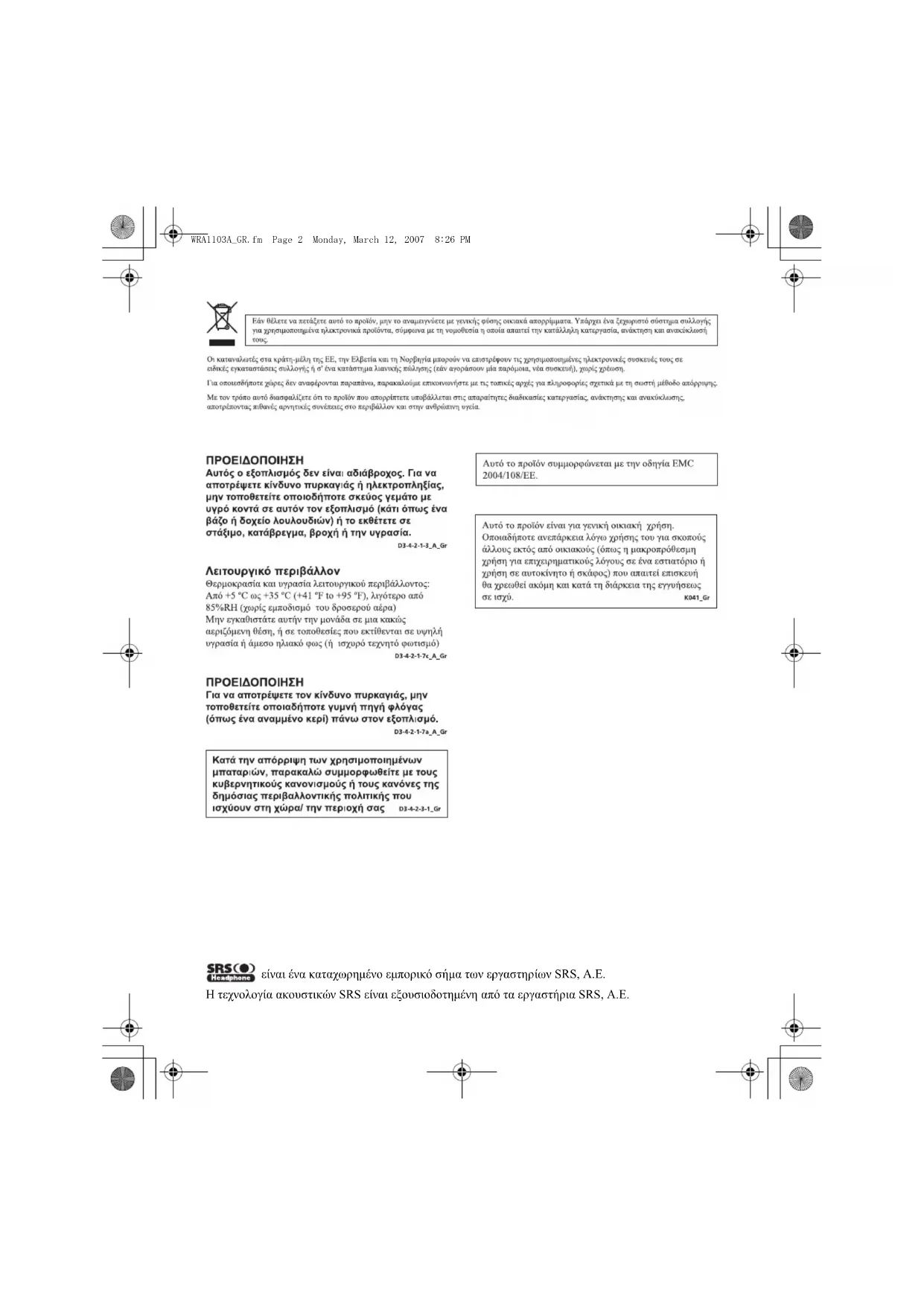 Svenska WRA1103A_SW.fm Page 9 Friday, March 30, 2007 4:38 PMείναι ένα καταχωρηµένο εµπορικό σήµα των εργαστηρίων SRS, Α.Ε. Η τεχνολογία ακουστικών SRS είναι εξουσιοδοτηµένη από τα εργαστήρια SRS, Α.Ε. WRA1103A_GR.fm Page 2 Monday, March 12, 2007 8:26 PM3