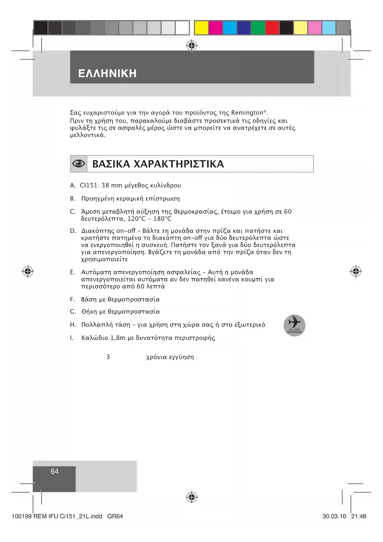 Κατεβάστε τις οδηγίες για το Ισιωτικό μαλλιών σε μορφή PDF δωρεάν! Βρείτε το εγχειρίδιό σας Ci151 - REMINGTON και πάρτε ξανά την ηλεκτρονική σας συσκευή στα χέρια σας. Σε αυτή τη σελίδα δημοσιεύονται όλα τα έγγραφα που απαιτούνται για τη χρήση της συσκευής σας. Ci151 της μάρκας REMINGTON.