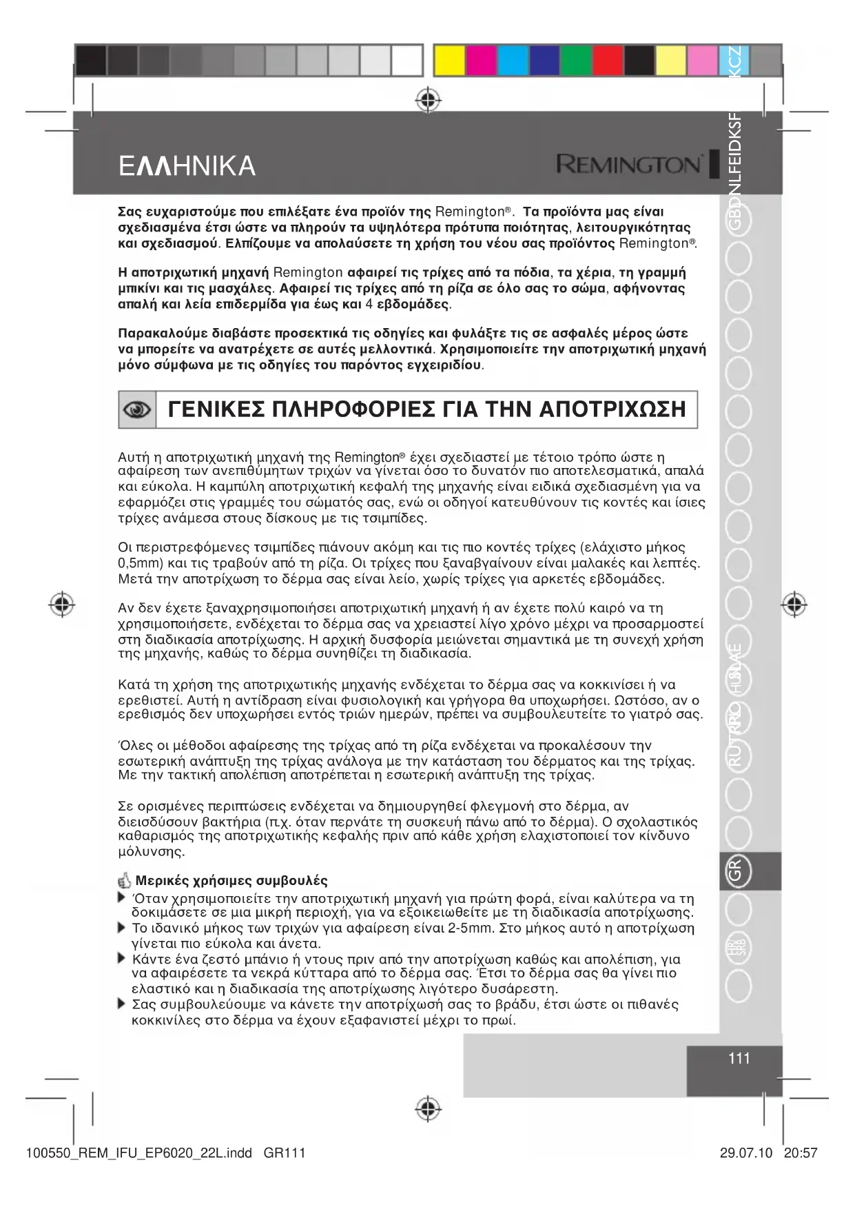 Η αποτριχωτική μηχανή Remington αφαιρεί τις τρίχες από τα πόδια, τα χέρια, τη γραμμή μπικίνι και τις μασχάλες. Αφαιρεί τις τρίχες από τη ρίζα σε όλο σας το σώμα, αφήνοντας απαλή και λεία επιδερμίδα για έως και 4 εβδομάδες. Παρακαλούμε διαβάστε προσεκτικά τις οδηγίες και φυλάξτε τις σε ασφαλές μέρος ώστε να μπορείτε να ανατρέχετε σε αυτές μελλοντικά. Χρησιμοποιείτε την αποτριχωτική μηχανή μόνο σύμφωνα με τις οδηγίες του παρόντος εγχειριδίου. ΓΕΝΙΚΕΣ ΠΛΗΡΟΦΟΡΙΕΣ ΓΙΑ ΤΗΝ ΑΠΟΤΡΙΧΩΣΗ Αυτή η αποτριχωτική μηχανή της Remington