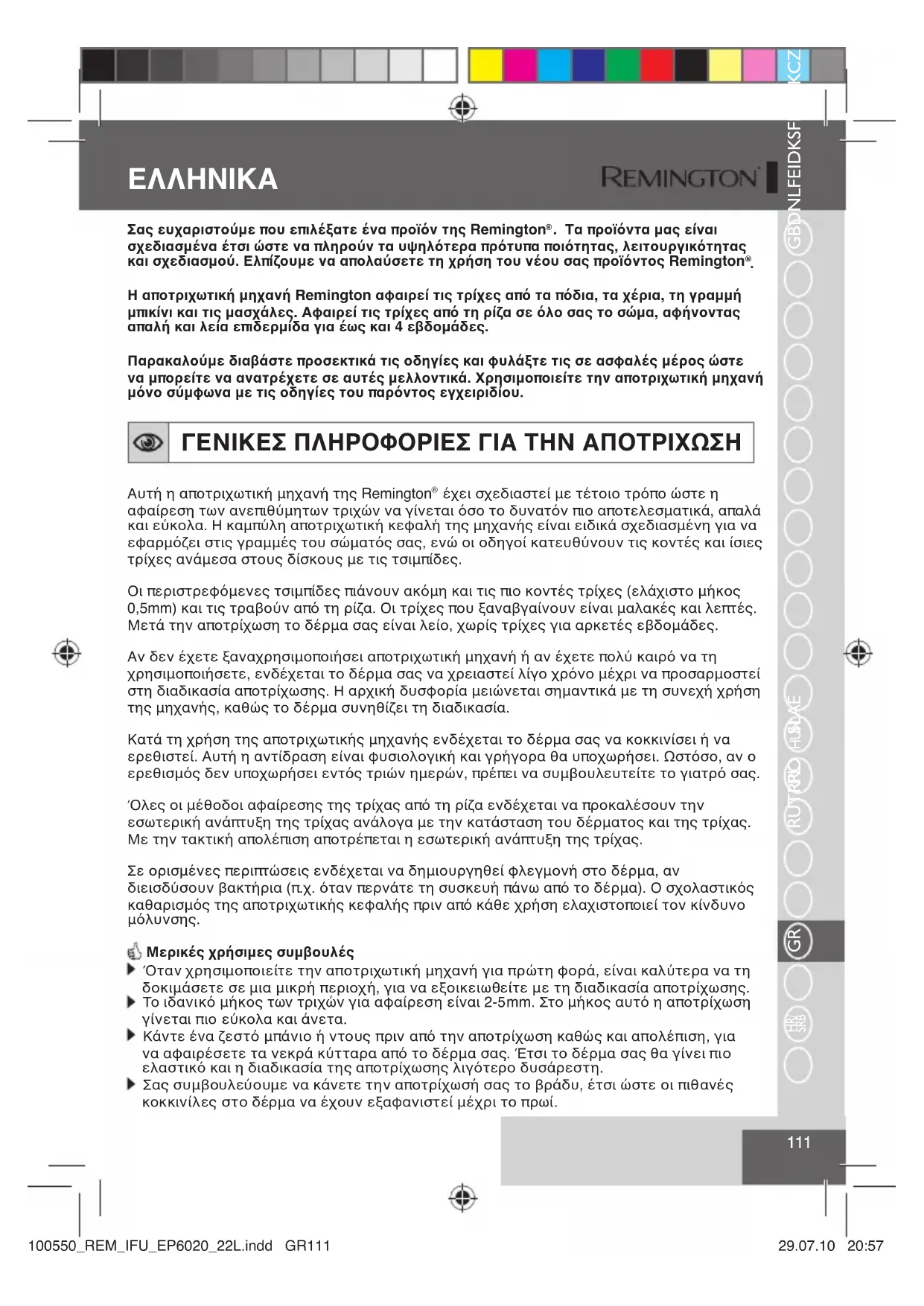 Η αποτριχωτική μηχανή Remington αφαιρεί τις τρίχες από τα πόδια, τα χέρια, τη γραμμή μπικίνι και τις μασχάλες. Αφαιρεί τις τρίχες από τη ρίζα σε όλο σας το σώμα, αφήνοντας απαλή και λεία επιδερμίδα για έως και 4 εβδομάδες. Παρακαλούμε διαβάστε προσεκτικά τις οδηγίες και φυλάξτε τις σε ασφαλές μέρος ώστε να μπορείτε να ανατρέχετε σε αυτές μελλοντικά. Χρησιμοποιείτε την αποτριχωτική μηχανή μόνο σύμφωνα με τις οδηγίες του παρόντος εγχειριδίου. ΓΕΝΙΚΕΣ ΠΛΗΡΟΦΟΡΙΕΣ ΓΙΑ ΤΗΝ ΑΠΟΤΡΙΧΩΣΗ Αυτή η αποτριχωτική μηχανή της Remington
