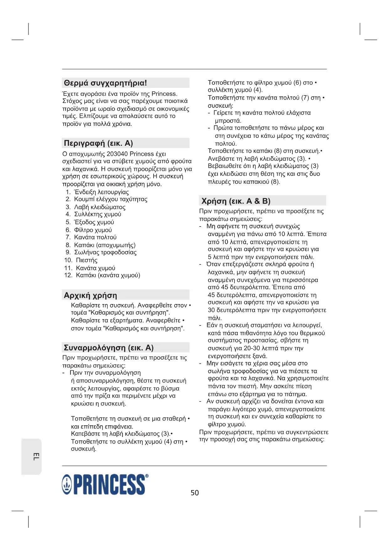 Θερμά συγχαρητήρια! Έχετε αγοράσει ένα προϊόν της Princess. Στόχος μας είναι να σας παρέχουμε ποιοτικά προϊόντα με ωραίο σχεδιασμό σε οικονομικές τιμές. Ελπίζουμε να απολαύσετε αυτό το προϊόν για πολλά χρόνια. Περιγραφή (εικ. A) Ο αποχυμωτής 203040 Princess έχει σχεδιαστεί για να στύβετε χυμούς από φρούτα και λαχανικά. Η συσκευή προορίζεται μόνο για χρήση σε εσωτερικούς χώρους. Η συσκευή προορίζεται για οικιακή χρήση μόνο.