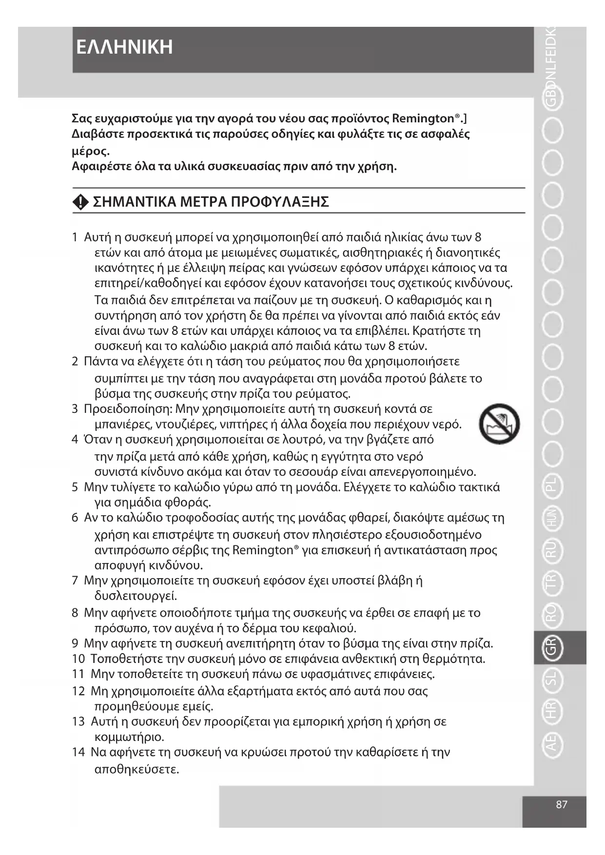 ROMANIA87 Σας ευχαριστούμε για την αγορά του νέου σας προϊόντος Remington®.]Διαβάστε προσεκτικά τις παρούσες οδηγίες και φυλάξτε τις σε ασφαλές μέρος.Αφαιρέστε όλα τα υλικά συσκευασίας πριν από την χρήση. F ΣΗΜΑΝΤΙΚΑ ΜΕΤΡΑ ΠΡΟΦΥΛΑΞΗΣ