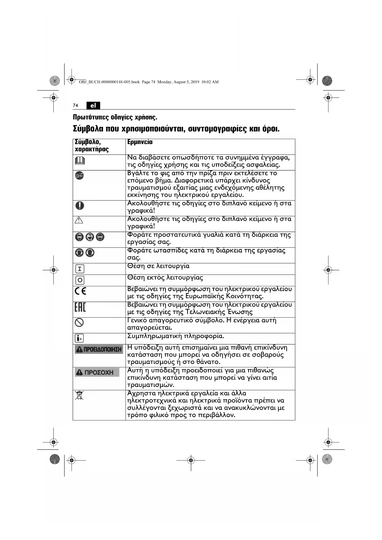 Θέση σε λειτουργία Θέση εκτός λειτουργίας Βεβαιώνει τη συμμόρφωση του ηλεκτρικού εργαλείου με τις οδηγίες της Ευρωπαϊκής Κοινότητας. Βεβαιώνει τη συμμόρφωση του ηλεκτρικού εργαλείου με τις οδηγίες της Τελωνειακής Ένωσης Γενικό απαγορευτικό σύμβολο. Η ενέργεια αυτή απαγορεύεται. Συμπληρωματική πληροφορία. Η υπόδειξη αυτή επισημαίνει μια πιθανή επικίνδυνη κατάσταση που μπορεί να οδηγήσει σε σοβαρούς τραυματισμούς ή στο θάνατο. Αυτή η υπόδειξη προειδοποιεί για μια πιθανώς επικίνδυνη κατάσταση που μπορεί να γίνει αιτία τραυματισμών. Άχρηστα ηλεκτρικά εργαλεία και άλλα ηλεκτροτεχνικά και ηλεκτρικά προϊόντα πρέπει να συλλέγονται ξεχωριστά και να ανακυκλώνονται με τρόπο φιλικό προς το περιβάλλον. OBJ_BUCH-0000000148-005.book Page 74 Monday, August 5, 2019 10:02 AM75