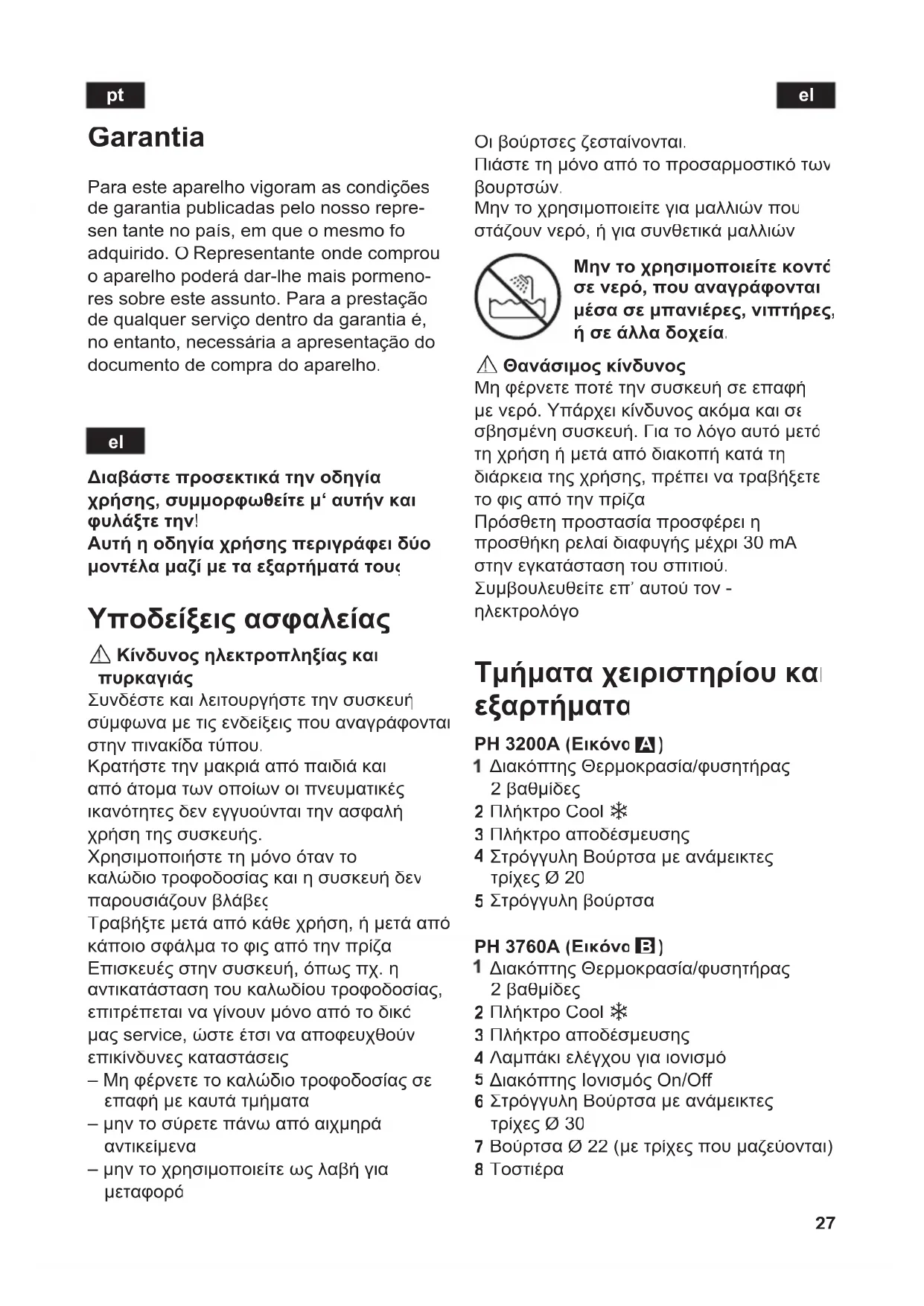 Θανάσιμος κίνδυνος Μη φέρνετε ποτέ την συσκευή σε επαφή με νερό. Υπάρχει κίνδυνος ακόμα και σε σβησμένη συσκευή. Για το λόγο αυτό μετά τη χρήση ή μετά από διακοπή κατά τη διάρκεια της χρήσης, πρέπει να τραβήξετε το φις από την πρίζα. Πρόσθετη προστασία προσφέρει η προσθήκη ρελαί διαφυγής μέχρι 30 mA στην εγκατάσταση του σπιτιού. Συμβουλευθείτε επ’ αυτού τον - ηλεκτρολόγο. Τμήματα χειριστηρίου και