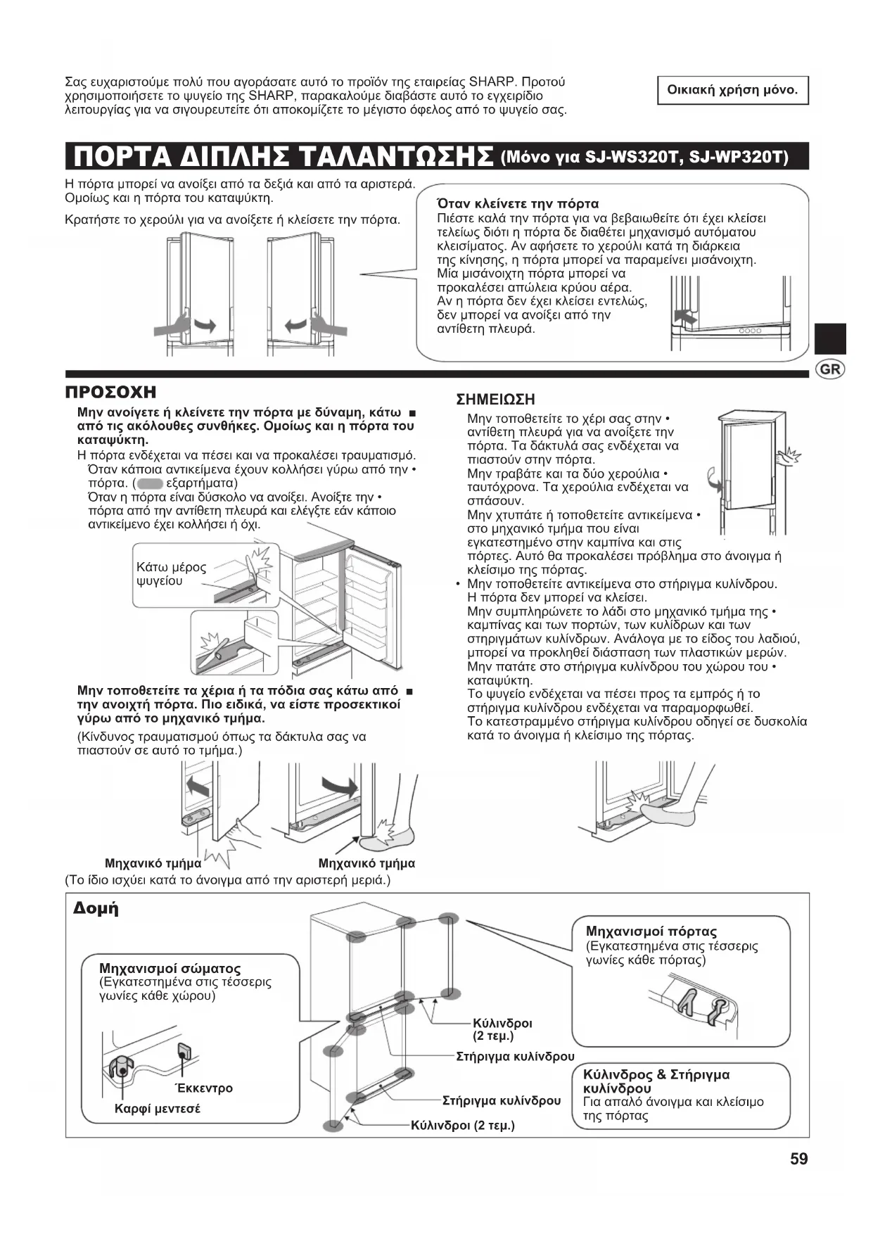 ΠΟΡΤΑ ΔΙΠΛΗΣ ΤΑΛΑΝΤΩΣΗΣ (Μόνο για SJ-WS320T, SJ-WP320T) Η πόρτα μπορεί να ανοίξει από τα δεξιά και από τα αριστερά.Ομοίως και η πόρτα του καταψύκτη.Κρατήστε το χερούλι για να ανοίξετε ή κλείσετε την πόρτα. Όταν κλείνετε την πόρτα Πιέστε καλά την πόρτα για να βεβαιωθείτε ότι έχει κλείσει τελείως διότι η πόρτα δε διαθέτει μηχανισμό αυτόματου κλεισίματος. Αν αφήσετε το χερούλι κατά τη διάρκεια της κίνησης, η πόρτα μπορεί να παραμείνει μισάνοιχτη. Μία μισάνοιχτη πόρτα μπορεί να προκαλέσει απώλεια κρύου αέρα. Αν η πόρτα δεν έχει κλείσει εντελώς, δεν μπορεί να ανοίξει από την αντίθετη πλευρά.(Το ίδιο ισχύει κατά το άνοιγμα από την αριστερή μεριά.) Μηχανισμοί σώματος (Εγκατεστημένα στις τέσσερις γωνίες κάθε χώρου)Στήριγμα κυλίνδρουΚύλινδροι (2 τεμ.)Κύλινδροι (2 τεμ.)Στήριγμα κυλίνδρου Μηχανισμοί πόρτας (Εγκατεστημένα στις τέσσερις γωνίες κάθε πόρτας) Κύλινδρος & Στήριγμα