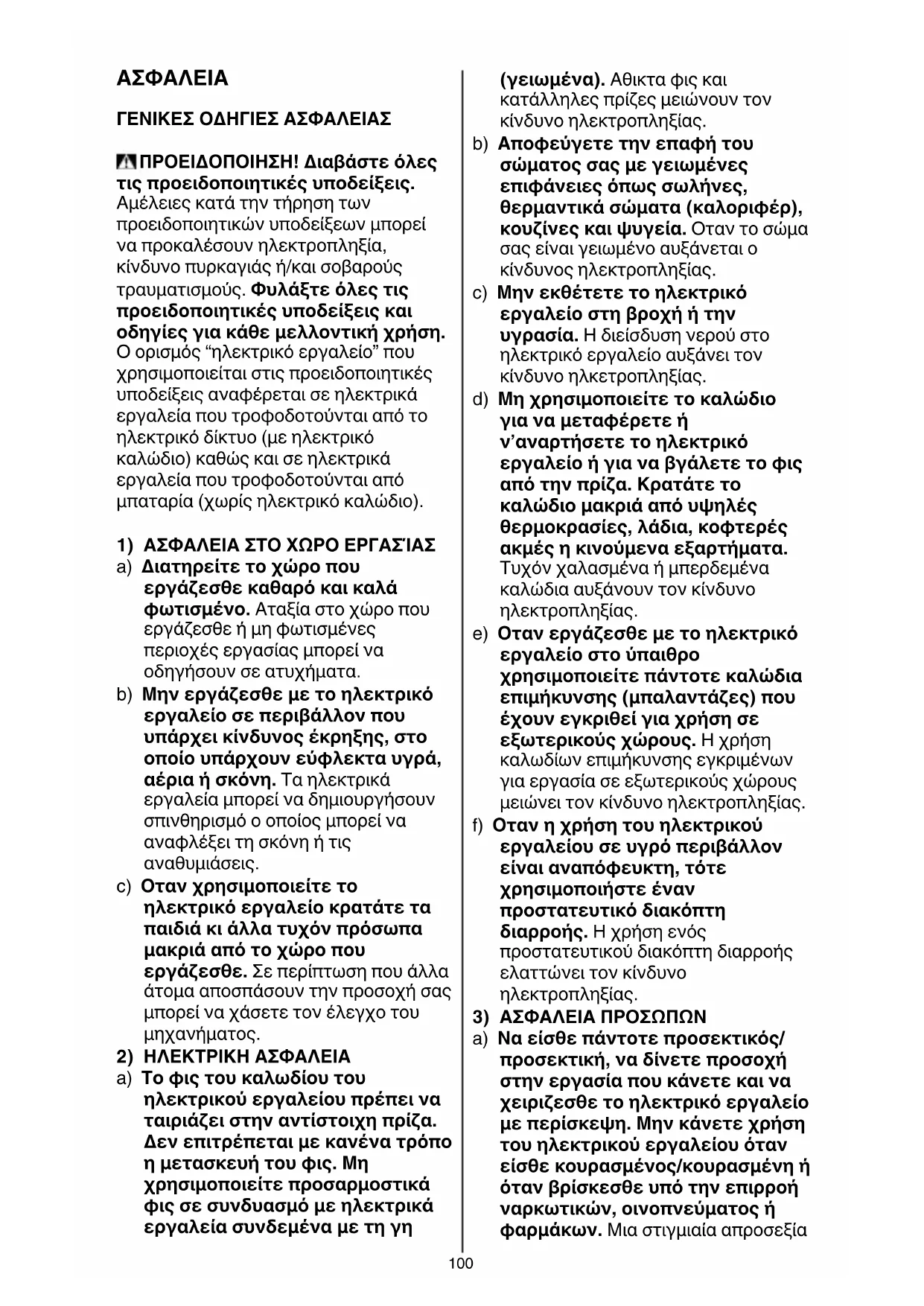 ΓΕΝΙΚΕΣ ΟΔΗΓΙΕΣ ΑΣΦΑΛΕΙΑΣ ΠΡΟEΙΔΟΠΟΙΗΣΗ! Διαβάστε όλες τις προειδοποιητικές υποδείξεις. Αμέλειες κατά την τήρηση των προειδοποιητικών υποδείξεων μπορεί να προκαλέσουν ηλεκτροπληξία, κίνδυνο πυρκαγιάς ή/και σοβαρούς τραυματισμούς. Φυλάξτε όλες τις προειδοποιητικές υποδείξεις και οδηγίες για κάθε μελλοντική χρήση. Ο ορισμός “ηλεκτρικό εργαλείο” που χρησιμοποιείται στις προειδοποιητικές υποδείξεις αναφέρεται σε ηλεκτρικά εργαλεία που τροφοδοτούνται από το ηλεκτρικό δίκτυο (με ηλεκτρικό καλώδιο) καθώς και σε ηλεκτρικά εργαλεία που τροφοδοτούνται από μπαταρία (χωρίς ηλεκτρικό καλώδιο).